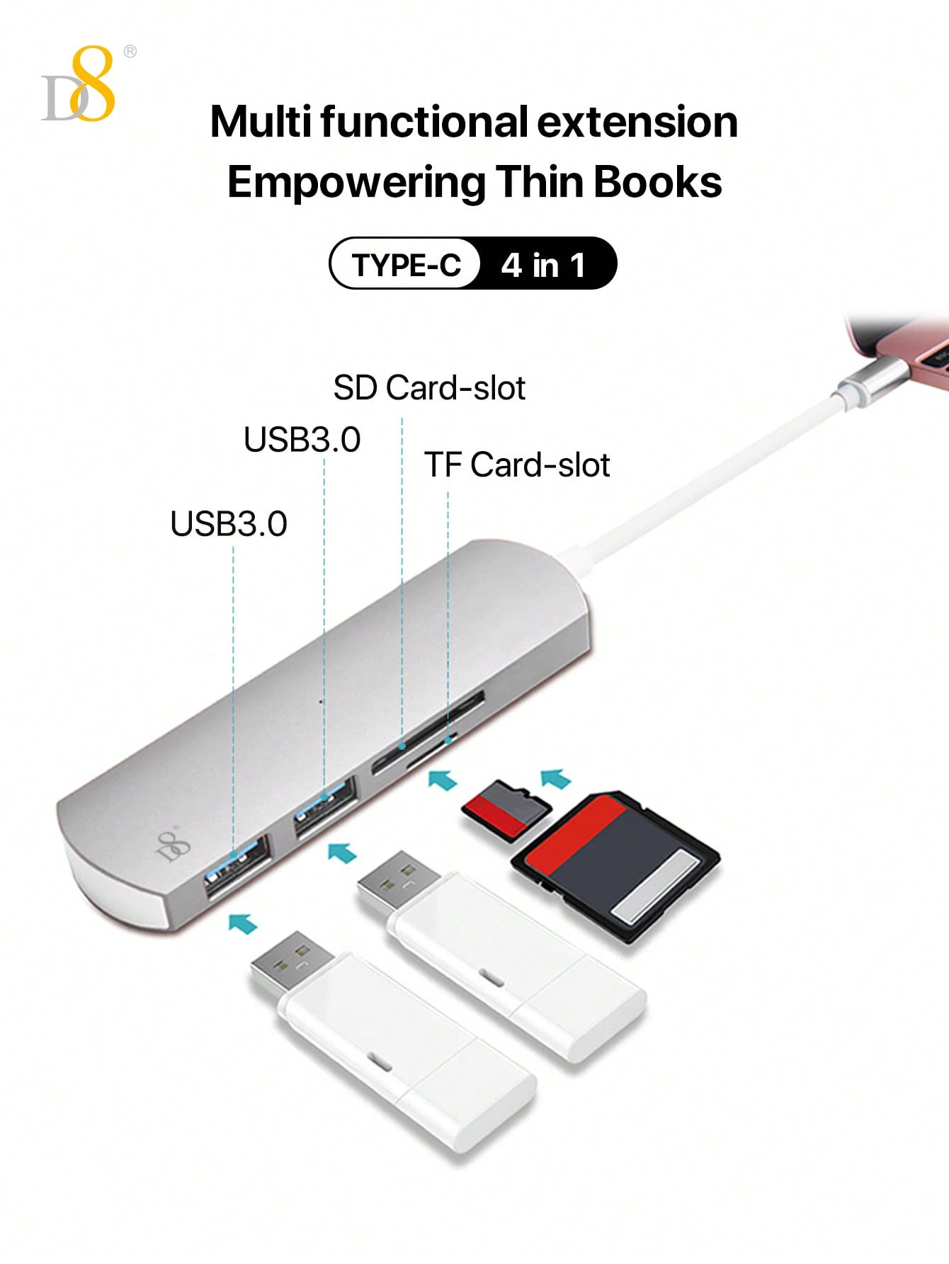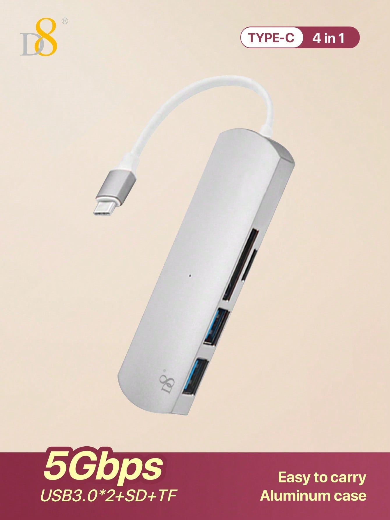D8 4-in-1 USB C Hub - USB-C, 2 USB A 3.0, SD/TF Reader, 5Gbps, Aluminum Design