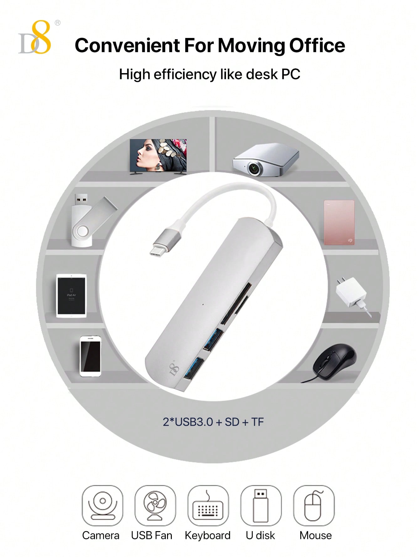 Expand your device’s connectivity with the D8 4-in-1 USB C Hub Multiport Adapter. Designed with a sleek aluminum body, it features USB-C input, two USB A 3.0 ports with 5Gbps transfer speed, and an SD/TF card reader. Compatible with iPhone 16/15 series, MacBook Pro (2021/2019/2018), Chromebook, Pixel, MateBook, and other USB-C devices.