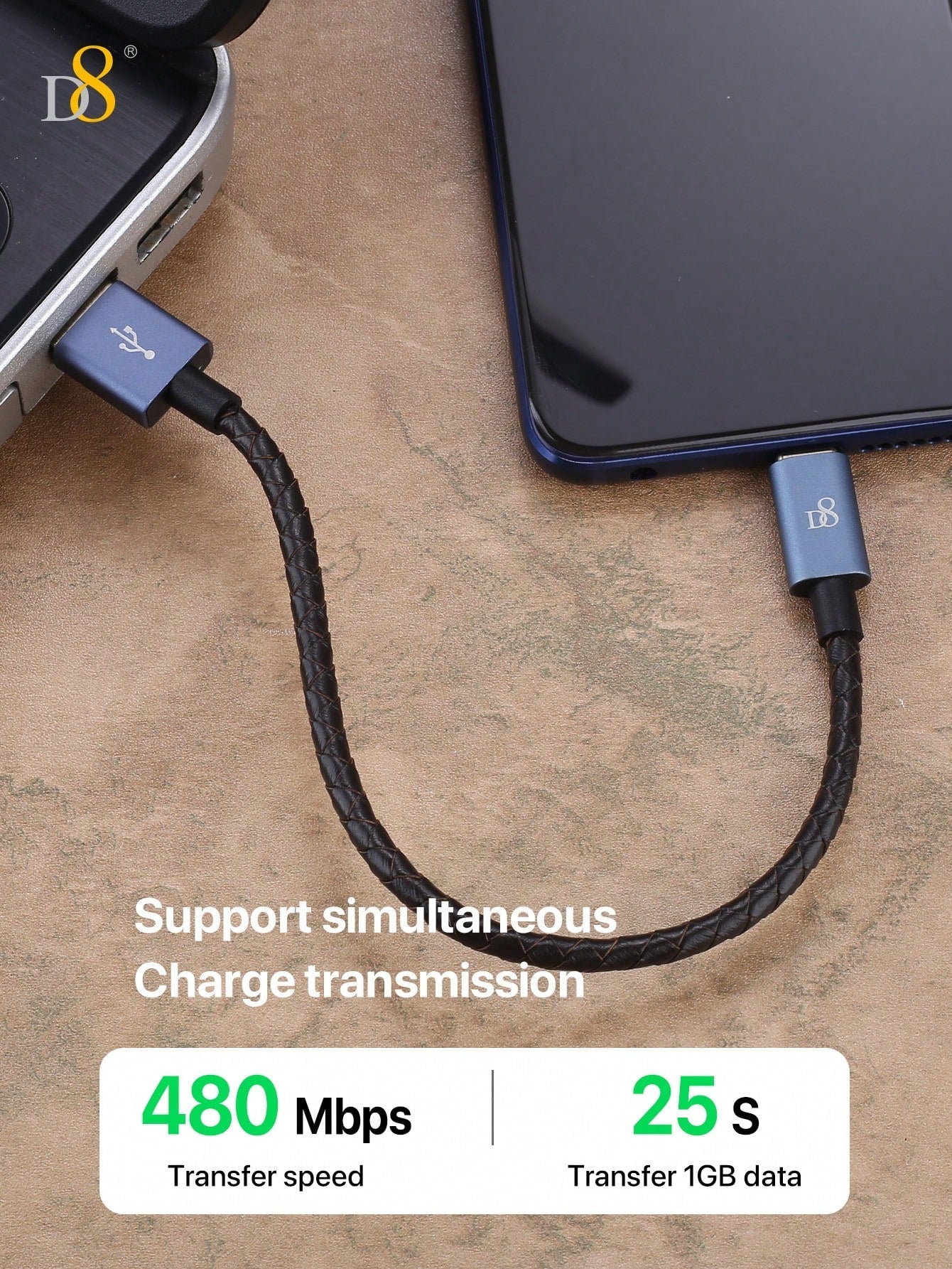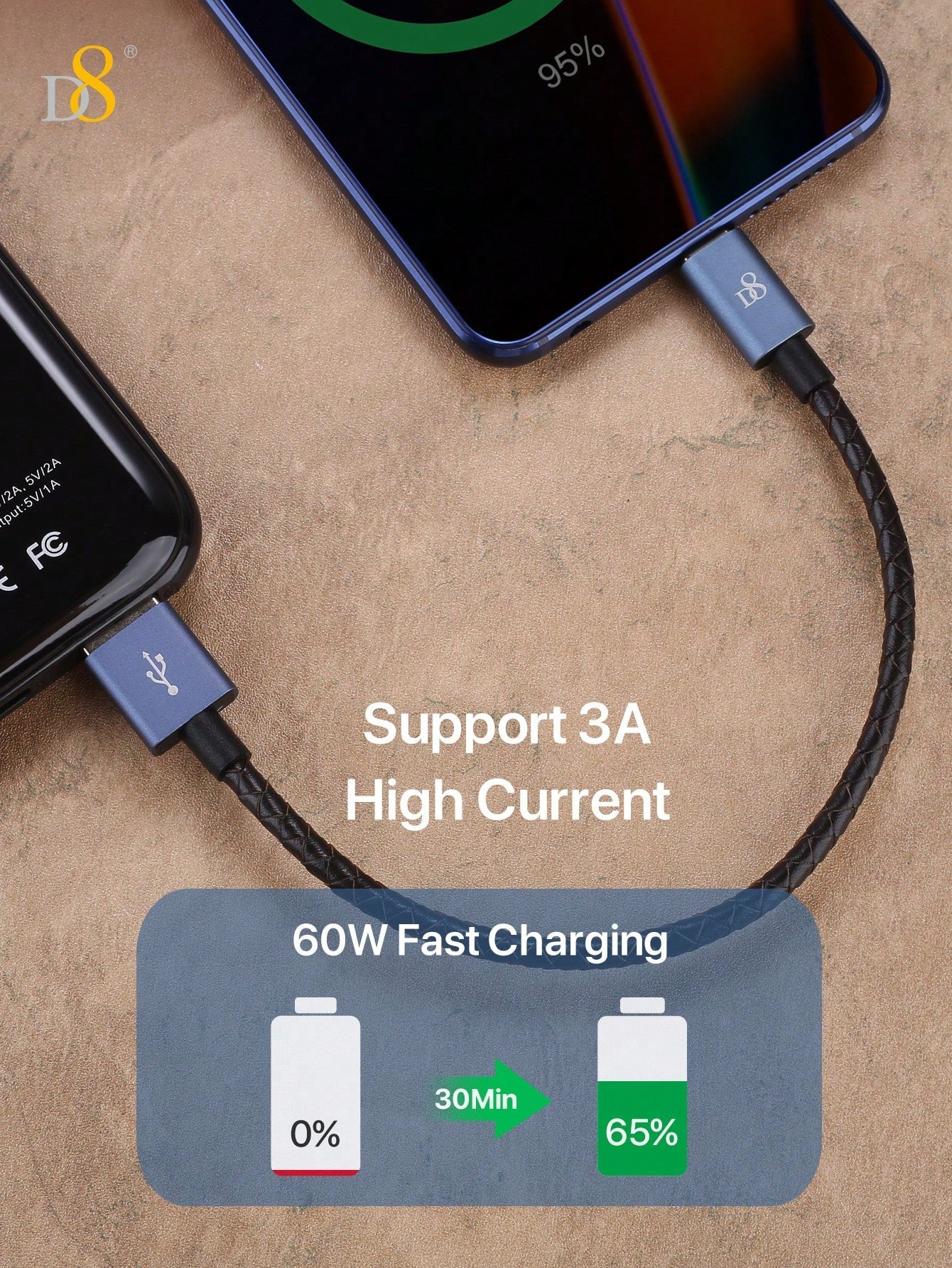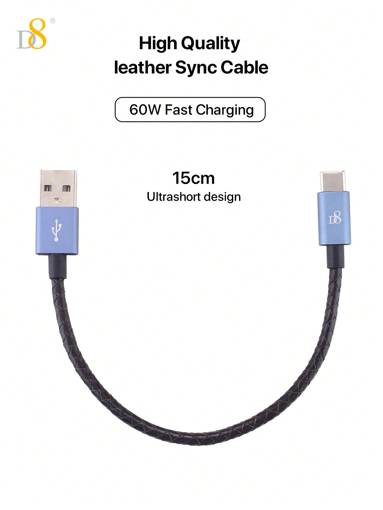 D8 Genuine Leather USB-C Cable, 60W/0.2m, USB-A to Type-C for iPhone/Galaxy