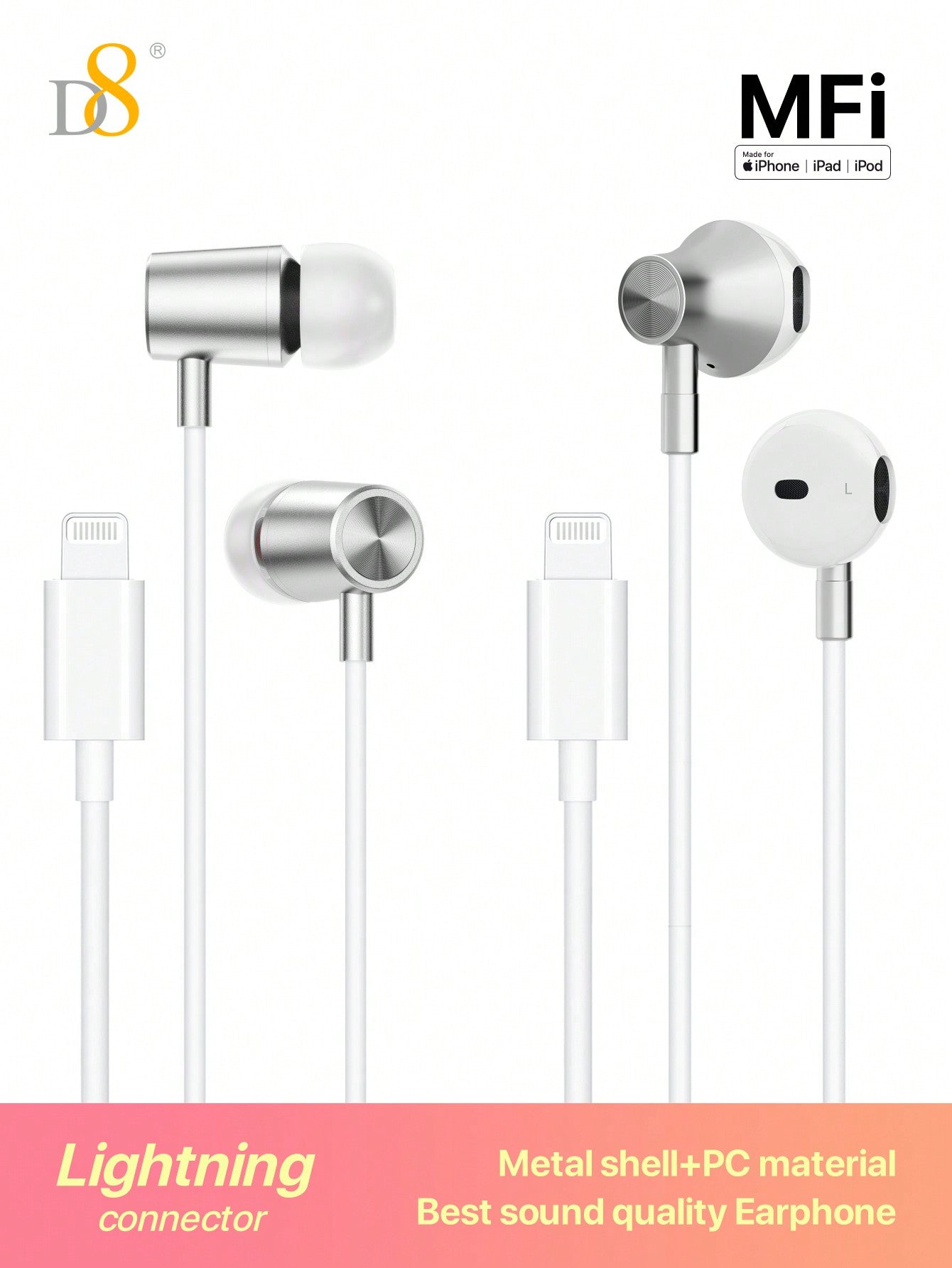 D8 MFi Certified Lightning Earbuds (2Pcs) with Mic Controller, Compatible with iPhone 14/13/12/11 Pro Max