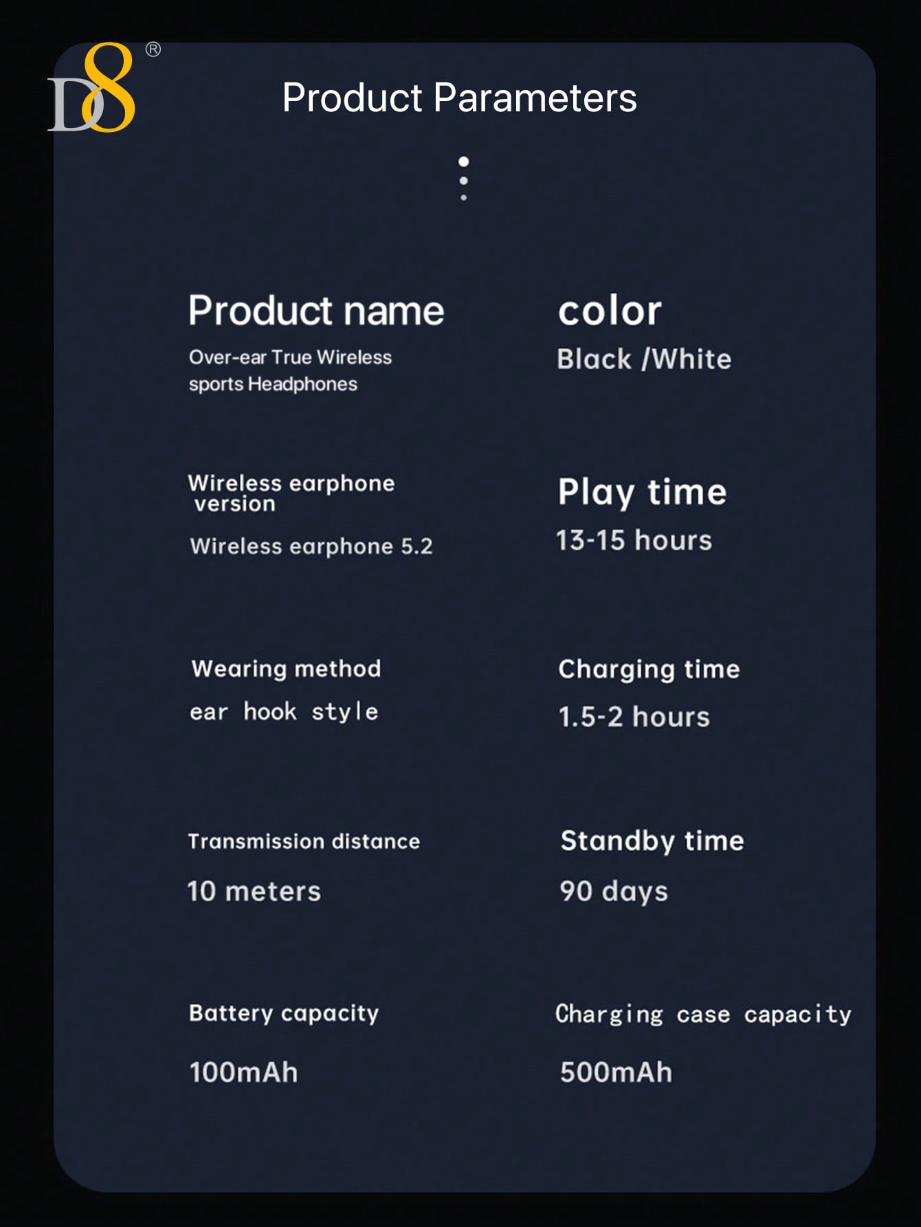 The D8 Open Ear-Mounted Wireless Sports Headphones combine innovation, comfort, and performance for an exceptional audio experience. With Bluetooth 5.2 connectivity, bass stereo sound, 15H playback time, and a waterproof design, these headphones are perfect for sports, outdoor activities, gaming, and more. The built-in mic and over-ear hooks offer convenience and security, while the wireless charging case ensures that your headphones are always ready when you are. Whether you’re working out, gaming, or on the go, these headphones deliver top-tier sound and comfort, with the added bonus of environmental awareness.