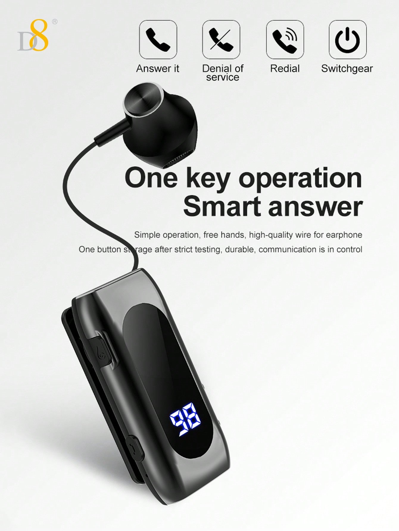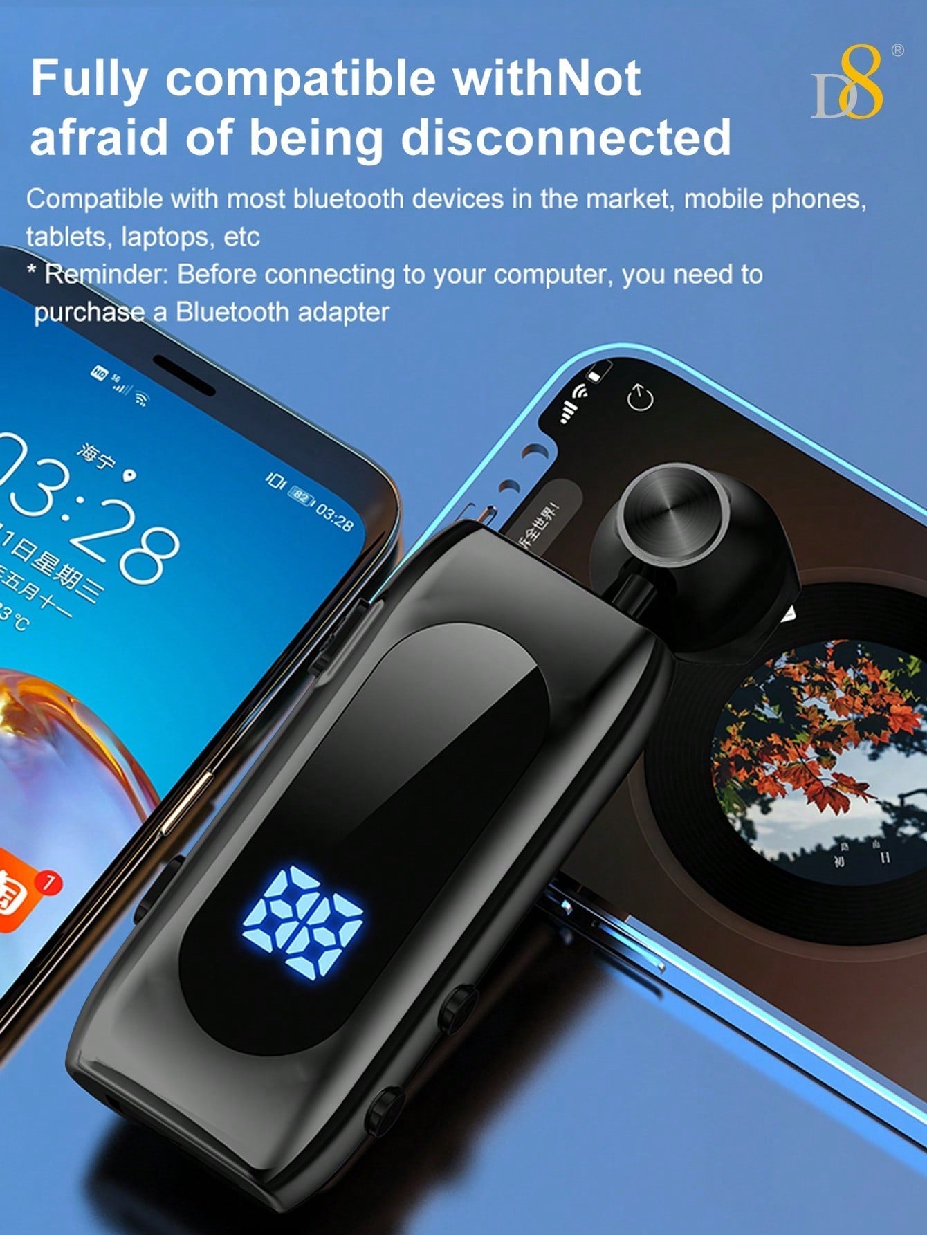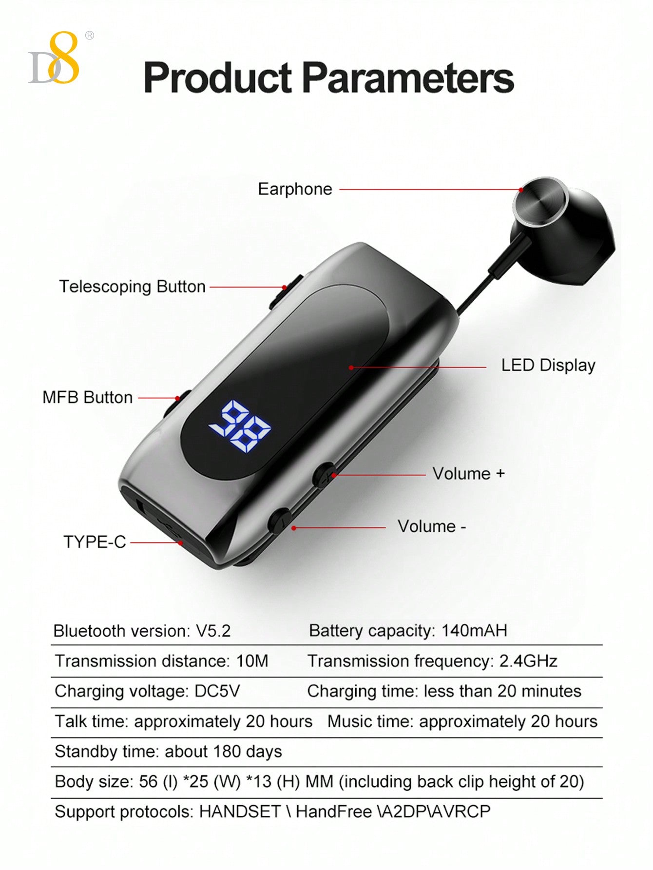 D8 Retractable Wireless Headset, LED Display, Noise-Canceling, 20H Talk