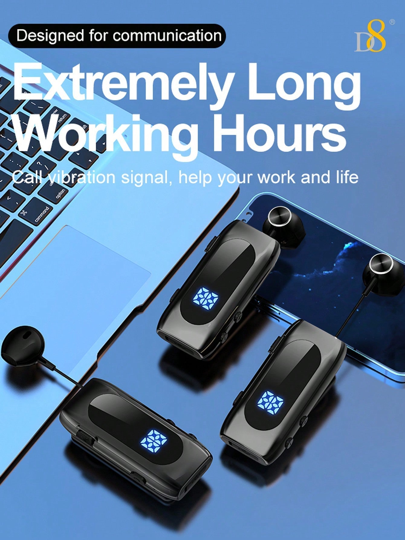 The D8 Retractable Wireless Headset is the ideal solution for those seeking comfort, quality, and convenience in their daily communication. With its LED display, noise-cancelling microphone, and over-ear design, this hands-free headset is perfect for sports, business, truckers, and drivers who need reliable audio during extended periods of use. Featuring 20 hours of talking time, it offers unmatched battery life for all-day conversations and entertainment.
