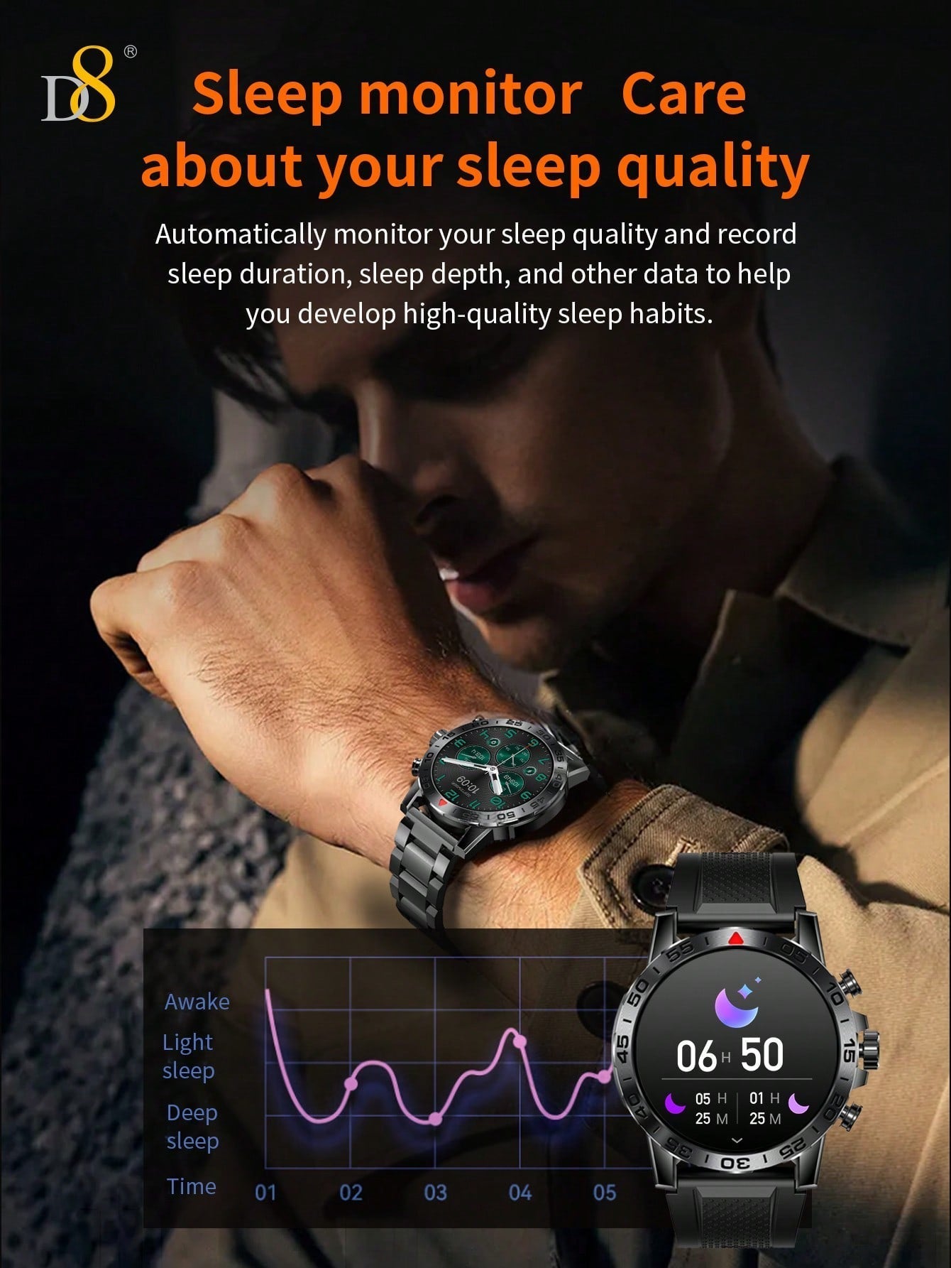 The D8 Smart Watch for Men is a robust, feature-packed smartwatch that combines rugged durability with powerful fitness and health monitoring features. Its 1.39" HD display, IP67 waterproof rating, and 100+ sports modes make it the perfect companion for outdoor activities, fitness tracking, and staying connected on the go. With additional features like sleep monitoring, heart rate tracking, and seamless compatibility with iPhone and Android, the D8 smartwatch is the ideal choice for men who want a dependable, stylish smartwatch to help them perform at their best.