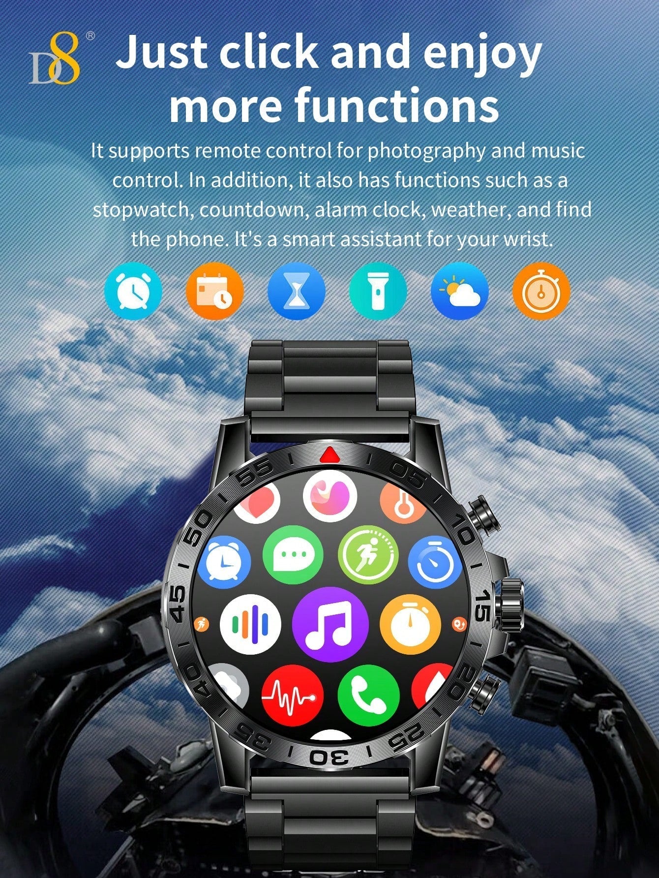 The D8 Smart Watch for Men is the ultimate rugged smartwatch designed to withstand the toughest conditions while delivering all the features you need to track your fitness and health. Featuring a 1.39" HD display, IP67 waterproof rating, and over 100 sports modes, this smartwatch is perfect for those who lead an active lifestyle. Whether you're working out, hiking, or navigating your day-to-day tasks, this smartwatch ensures you stay connected and track your health with its sleep monitoring, heart rate tracking, and fitness capabilities. Compatible with both iPhone and Android devices, the D8 smartwatch keeps you connected and on top of your goals, no matter where you are.