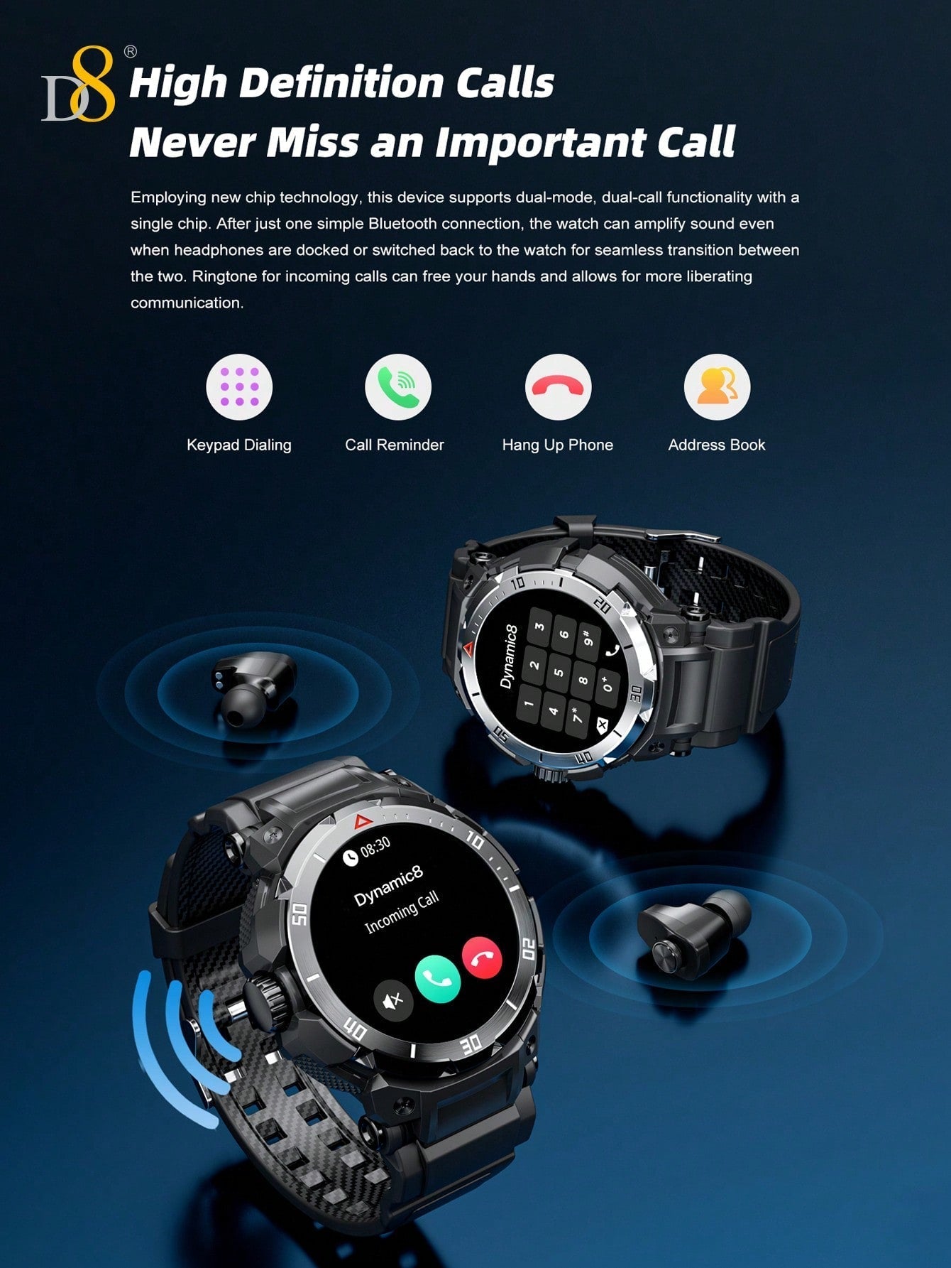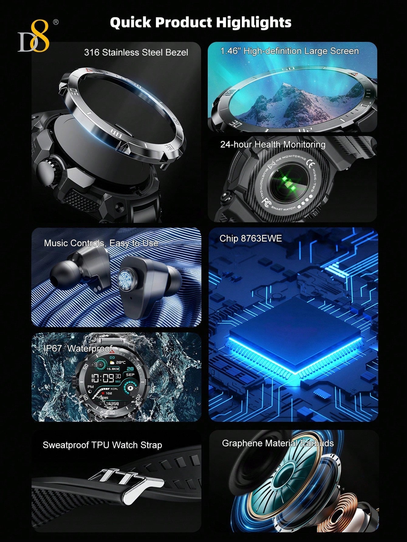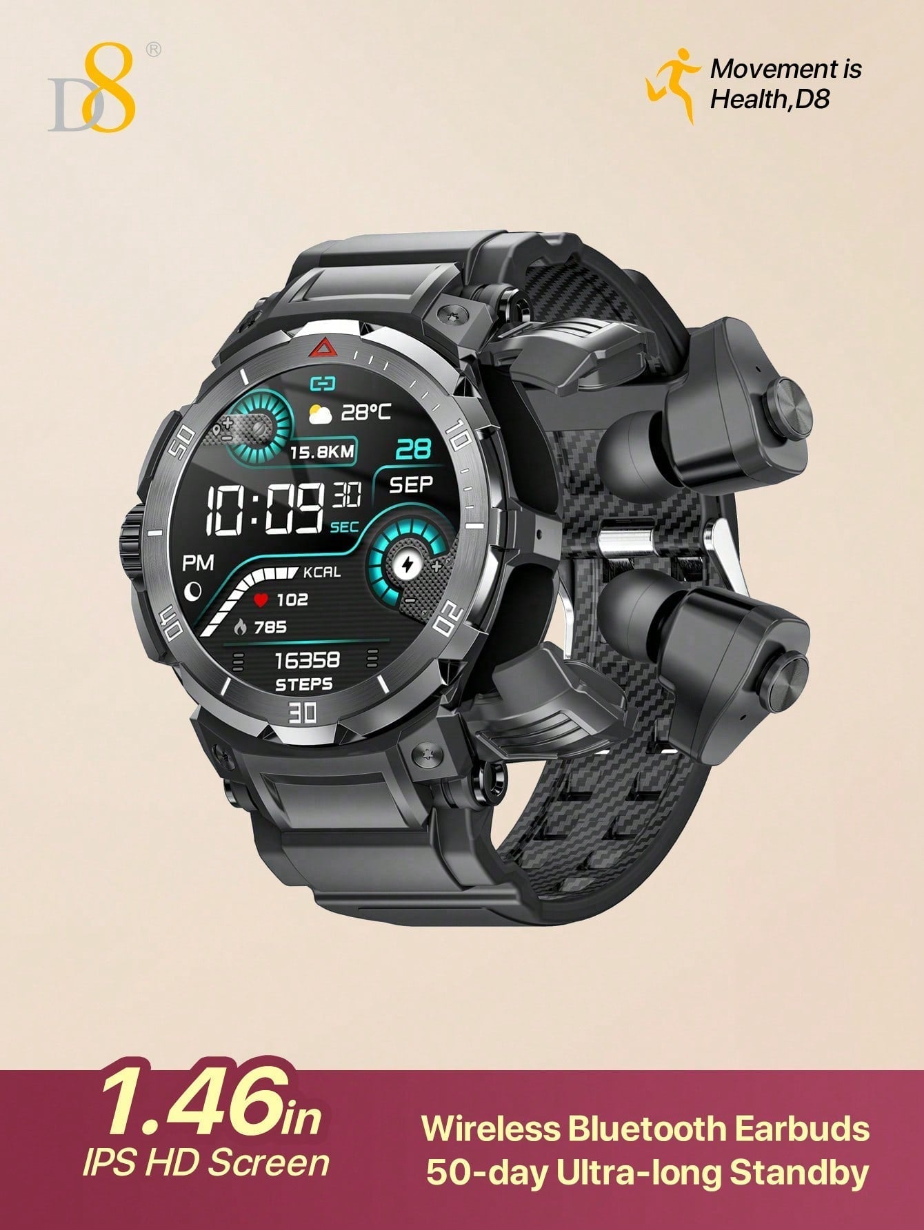 The D8 Smart Watch with Earbuds is a versatile, all-in-one device designed for those who prioritize fitness, communication, and entertainment. With its 1.46" HD touch screen, 9D sound effects, and over 110 fitness and sleep tracking modes, it empowers you to achieve your health goals while staying connected. Whether you're running, swimming, or simply relaxing, this smartwatch provides you with the tools you need for a balanced, connected lifestyle. Waterproof and compatible with both iOS and Android, the D8 Smart Watch is the ultimate accessory for the modern, active individual.