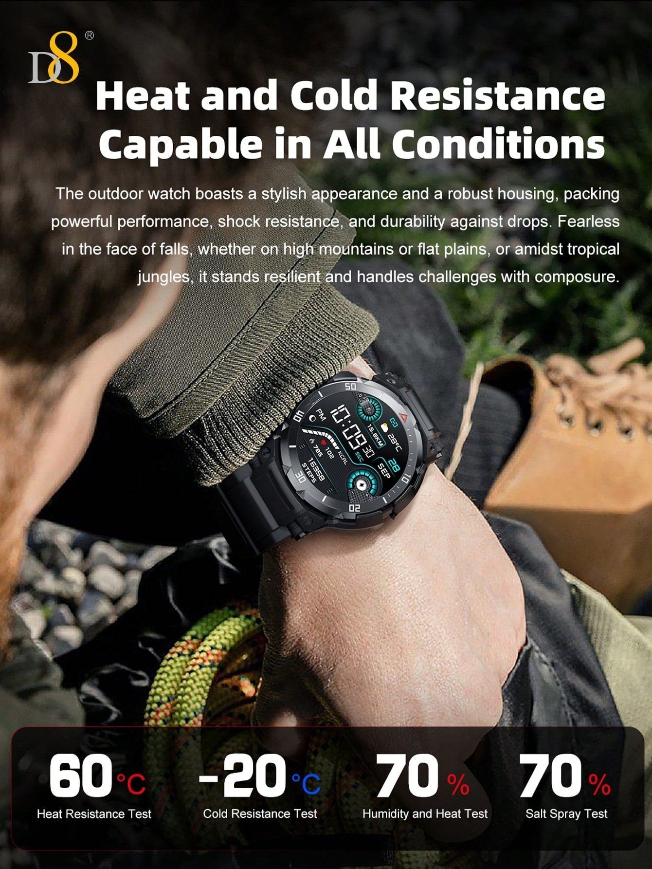 - Outdoor Activities: With its waterproof rating and durable design, the D8 Smart Watch is built to withstand outdoor conditions, making it ideal for outdoor sports and fitness routines.