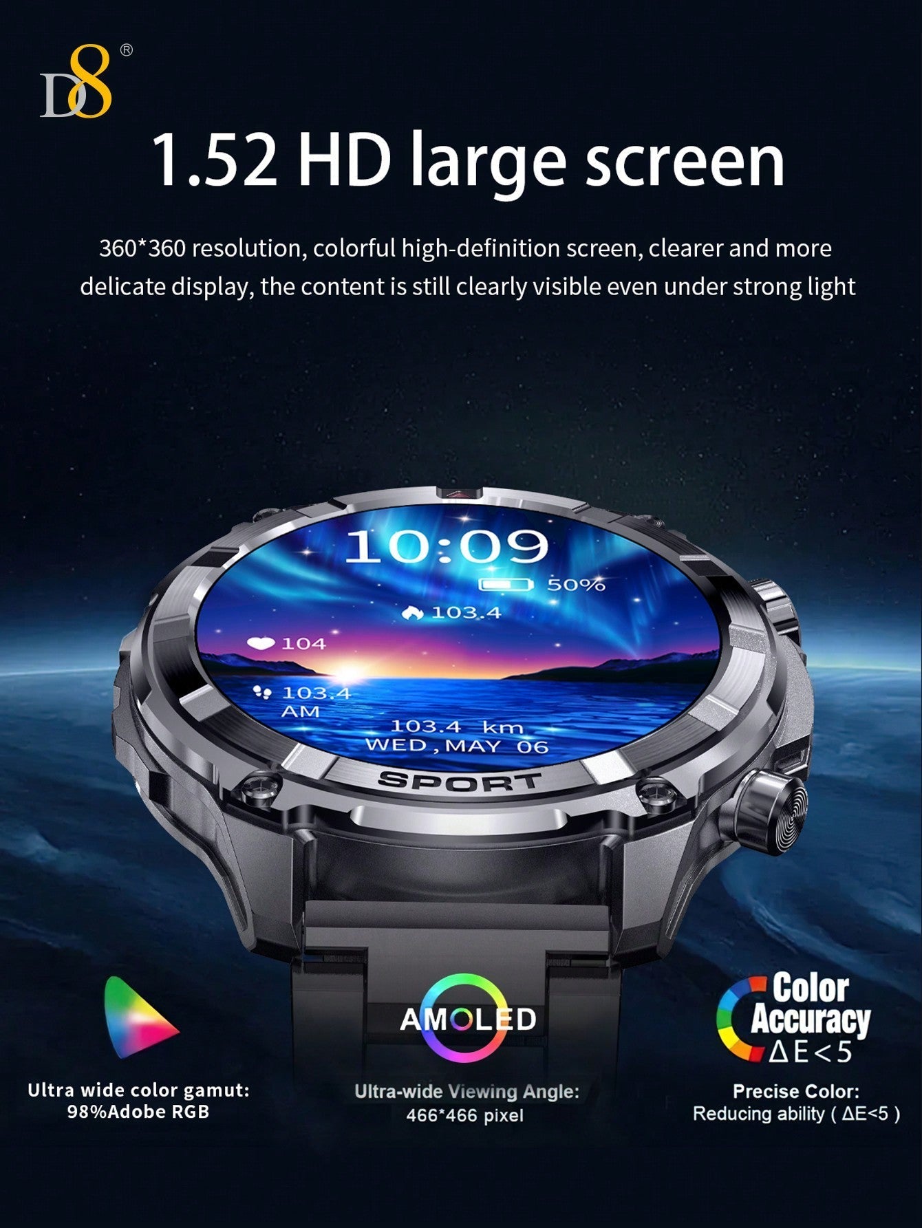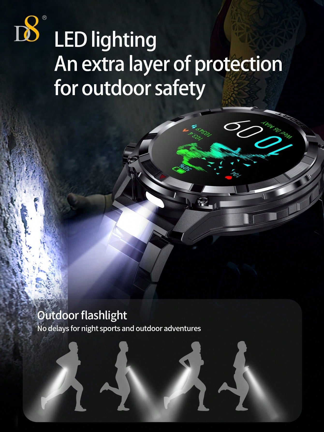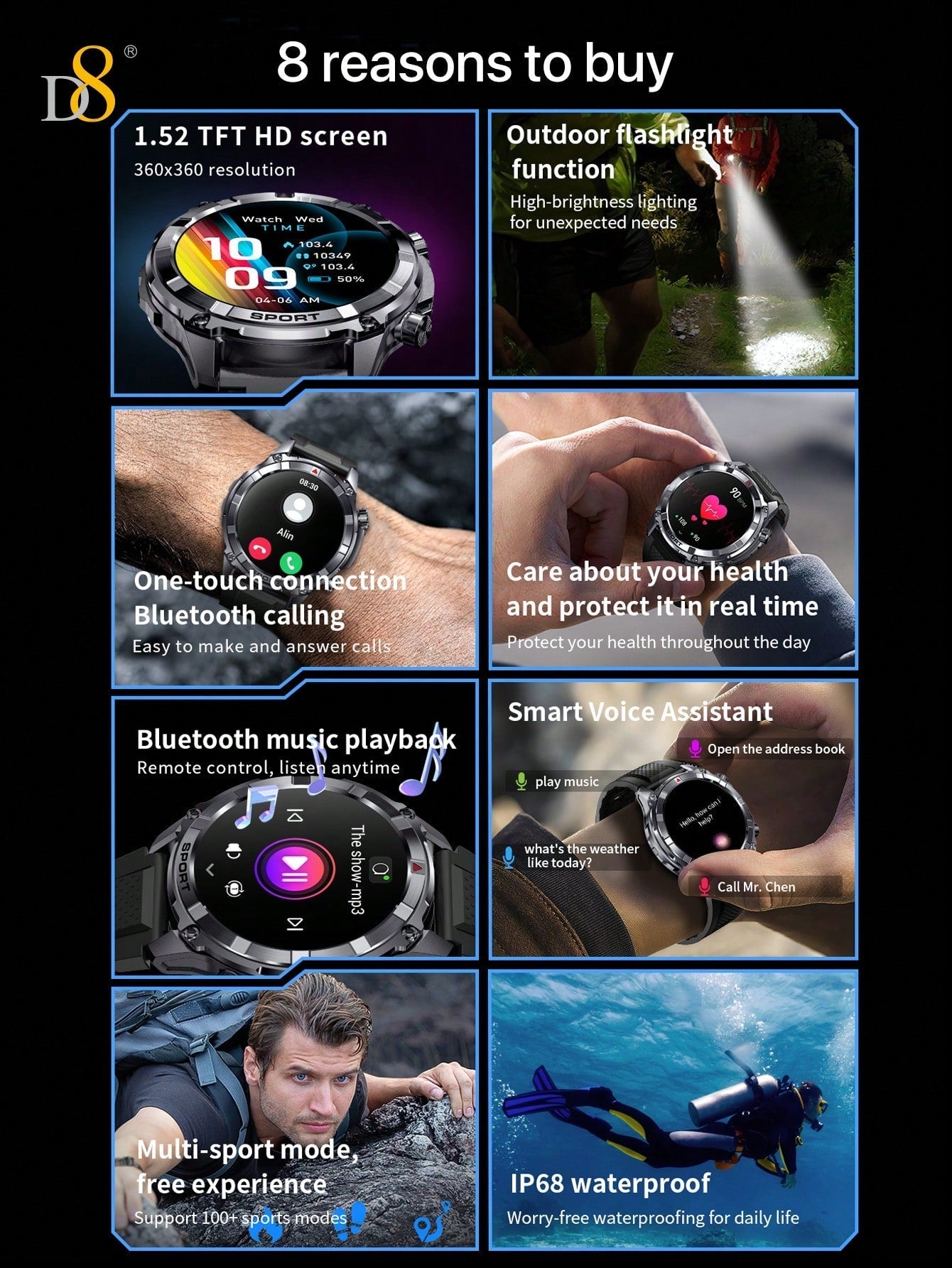 The D8 Smart Watch for Men is designed for adventurers, fitness enthusiasts, and those who love outdoor activities. This 2024 model features a 1.52" HD display that offers clear visuals, even in bright sunlight, along with an LED flashlight perfect for low-light situations. Whether you're hiking, cycling, or working out, this smartwatch combines advanced features like fitness tracking, 100+ sports modes, and IP68 waterproof protection, ensuring it can withstand any challenge. The ability to make and answer calls directly from the watch makes it the ideal companion for modern, active individuals. It’s the smartwatch that adapts to your lifestyle.