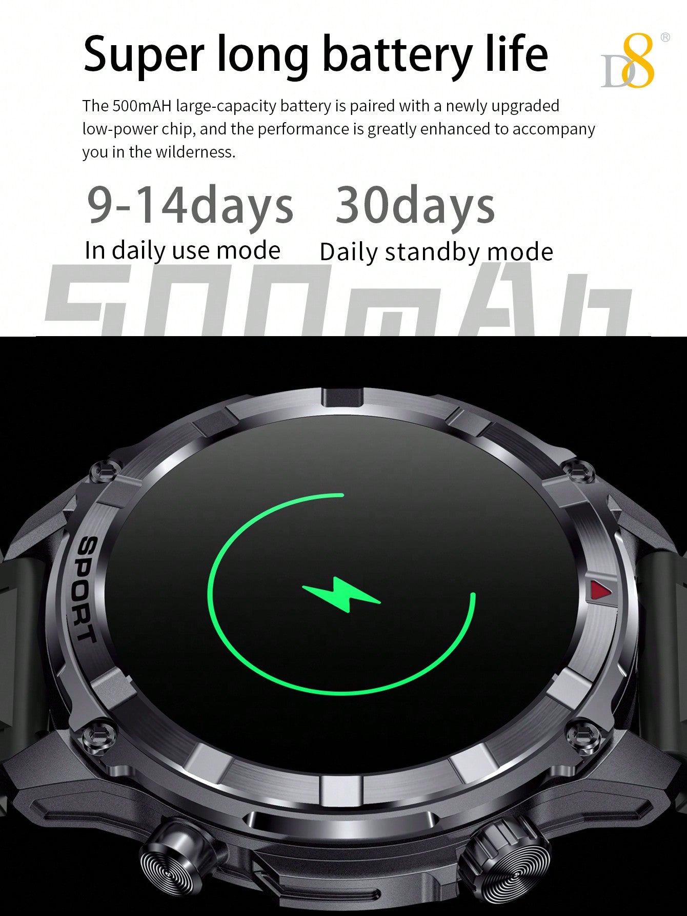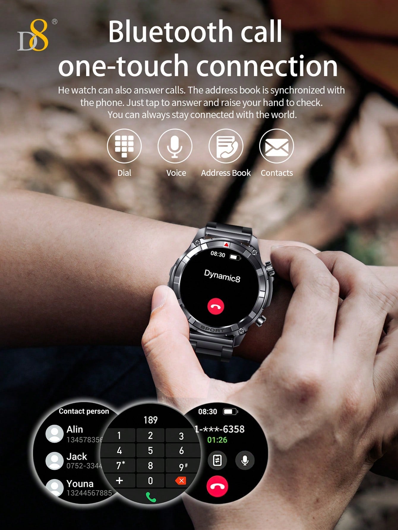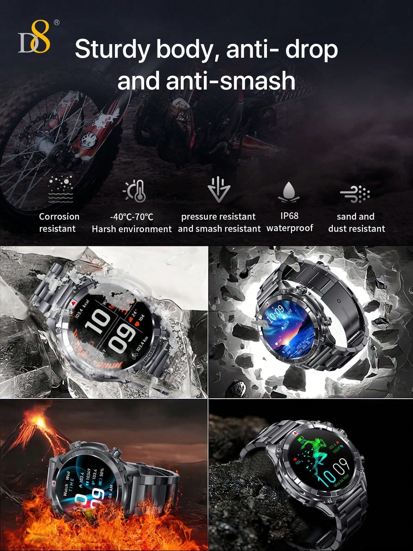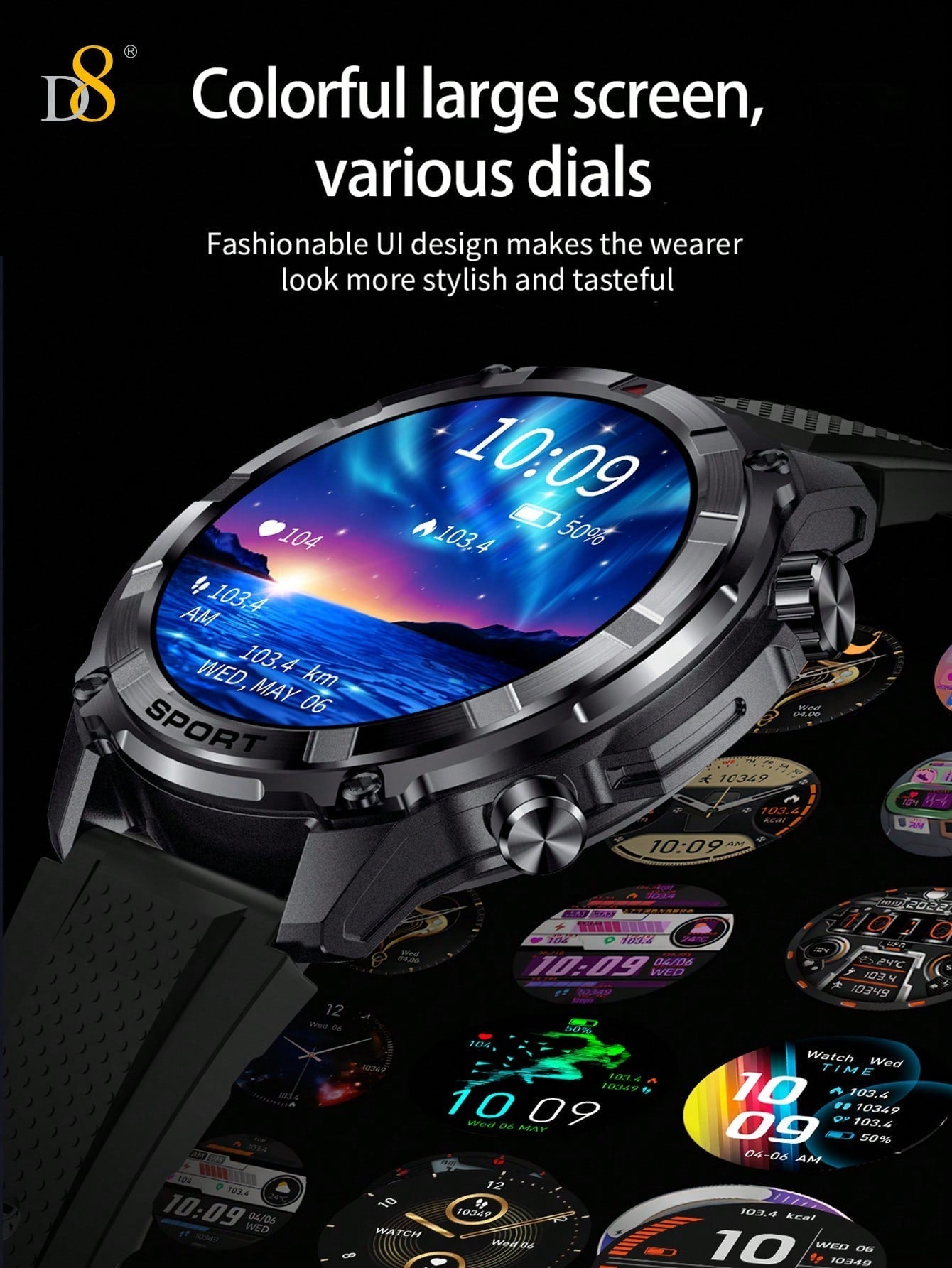 The D8 Smart Watch for Men is designed for adventurers, fitness enthusiasts, and those who love outdoor activities. This 2024 model features a 1.52" HD display that offers clear visuals, even in bright sunlight, along with an LED flashlight perfect for low-light situations. Whether you're hiking, cycling, or working out, this smartwatch combines advanced features like fitness tracking, 100+ sports modes, and IP68 waterproof protection, ensuring it can withstand any challenge. The ability to make and answer calls directly from the watch makes it the ideal companion for modern, active individuals. It’s the smartwatch that adapts to your lifestyle.