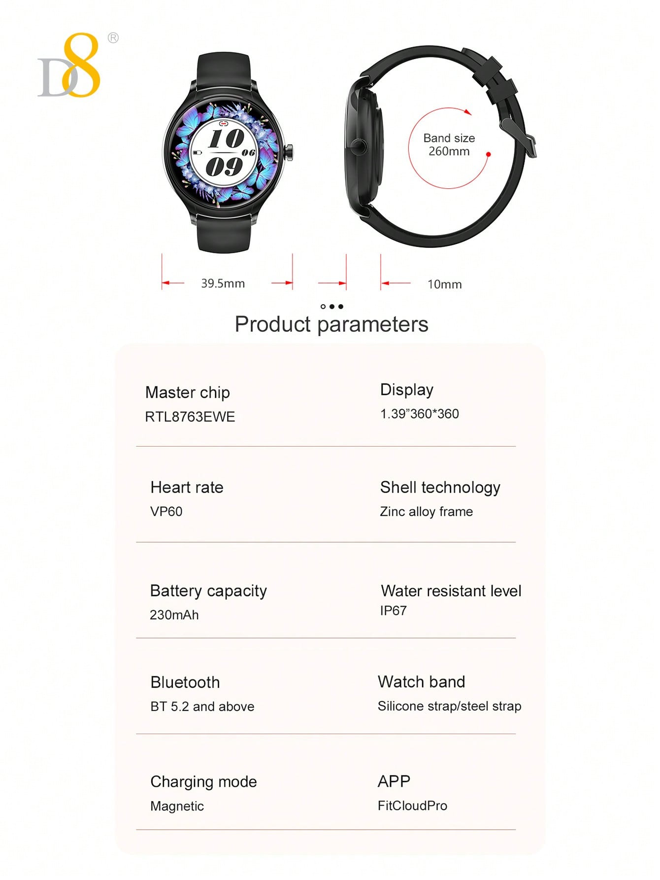 - Sleek & Stylish Design: The D8 smartwatch offers a sleek and modern look, perfect for any occasion, whether you're working out or dressing up for a night out.