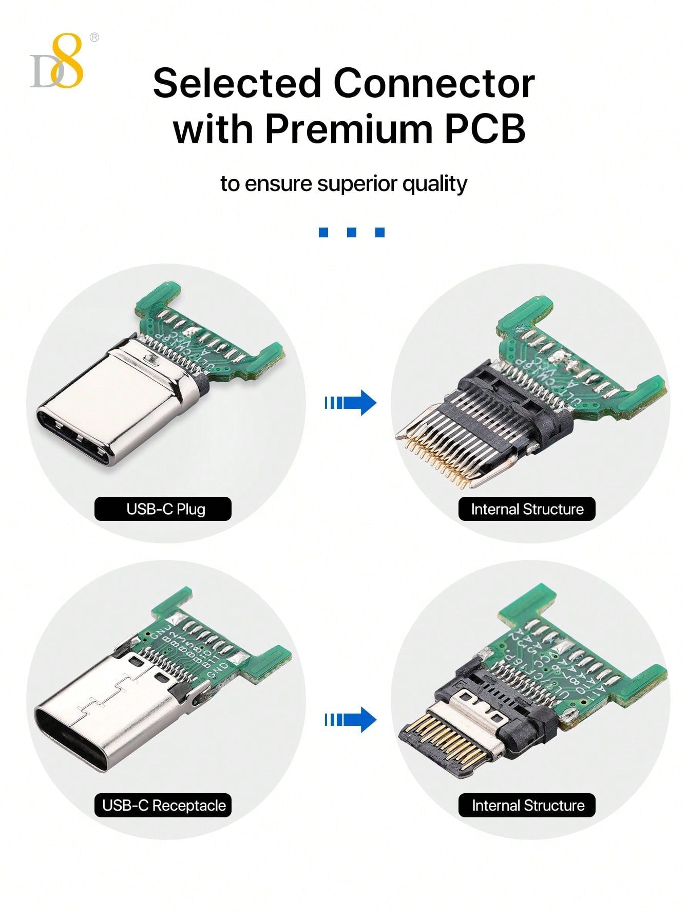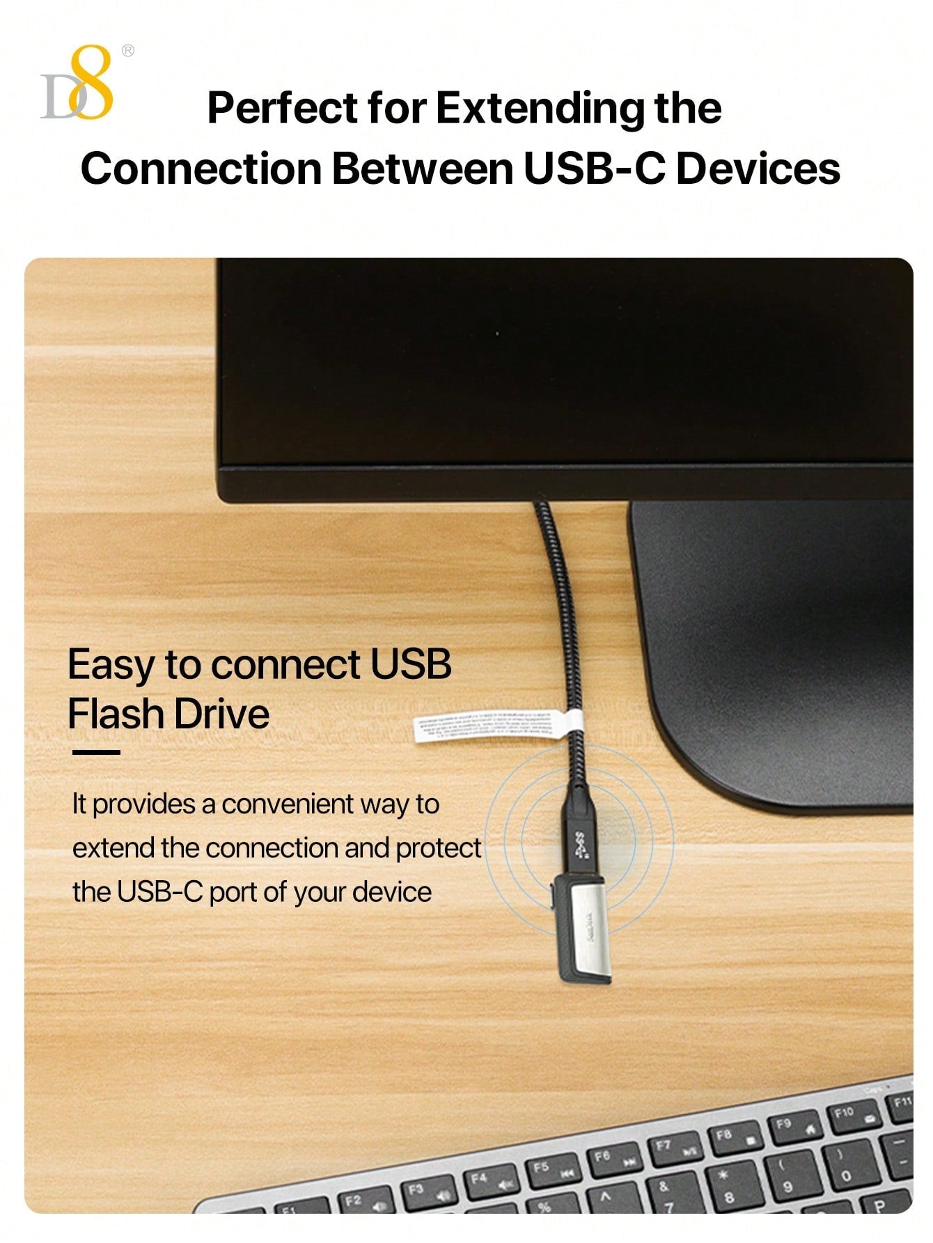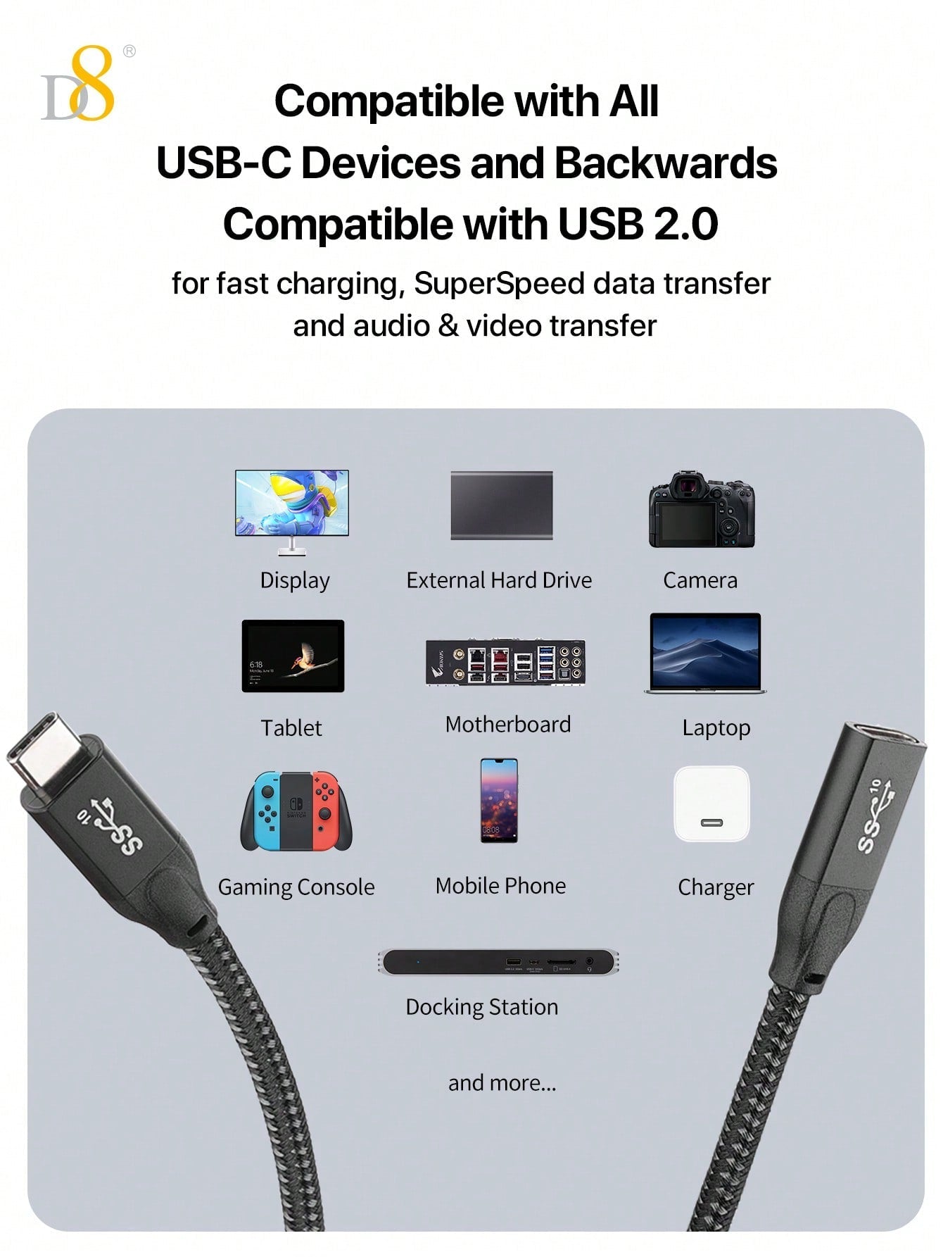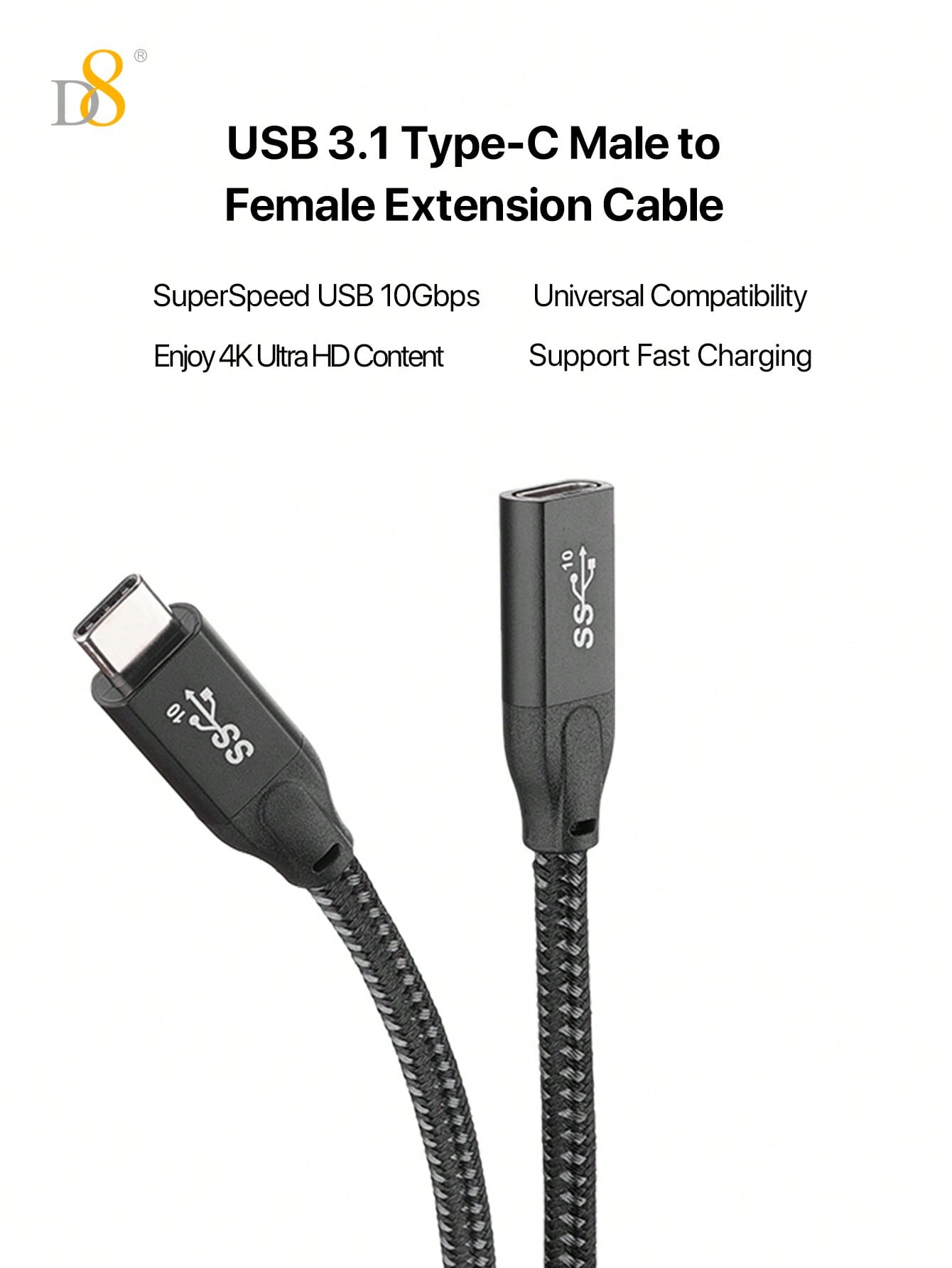 The D8 USB 3.1 Type-C Male to Female Extension Cable combines speed, durability, and versatility to meet the demands of modern USB-C devices. Offering 10Gbps data transfer and 4K Ultra HD content support, it is the ideal solution for enhancing the performance and connectivity of your iPhone, iPad, and other USB-C devices. Whether you're transferring files, streaming video, or extending your connection, this cable delivers seamless performance for all your needs.