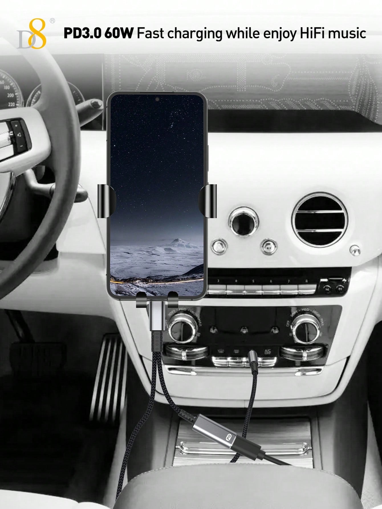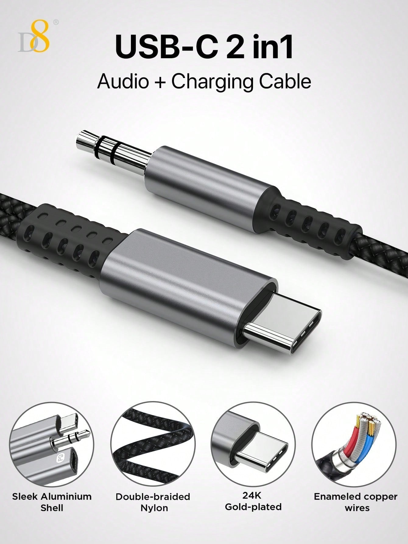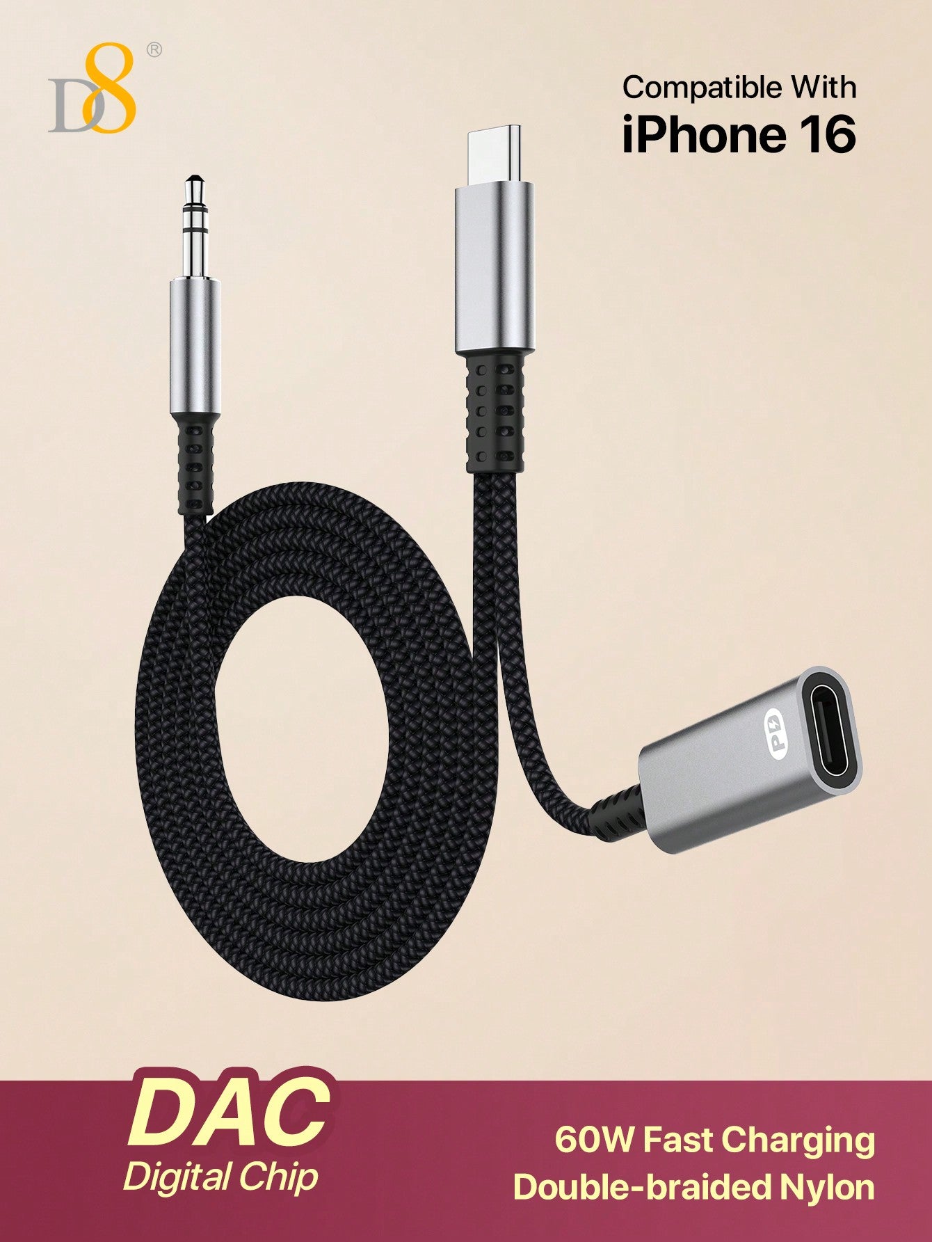 The D8 USB C to 3.5mm Aux Cable with Charger is the ultimate solution for those who need both audio and charging capabilities in one compact cable. This 2-in-1 USB C to 3.5mm Aux cable features PD 60W fast charging and allows you to connect your USB C devices like the iPhone 16/16 Pro, Galaxy S24 Ultra, Pixel 8, and many others to 3.5mm headphones or car stereo systems. Whether you’re on a road trip or enjoying your favorite tunes at home, this multifunctional cable ensures you never have to choose between charging and listening to music.