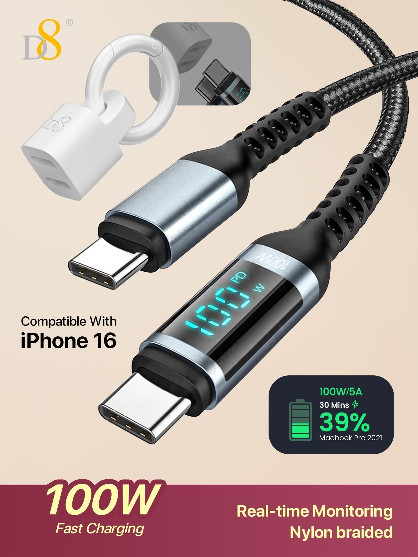 The D8 USB-C to USB-C Cable is the ultimate charging solution for modern devices. With its 100W fast charging, 5A power delivery, nylon braid for durability, and LED display, this cable offers a high-performance, versatile charging experience. Whether you need to charge your iPhone 15 Max, iPad Pro 2023, or Samsung Galaxy S23, this cable delivers the speed, safety, and reliability you need.