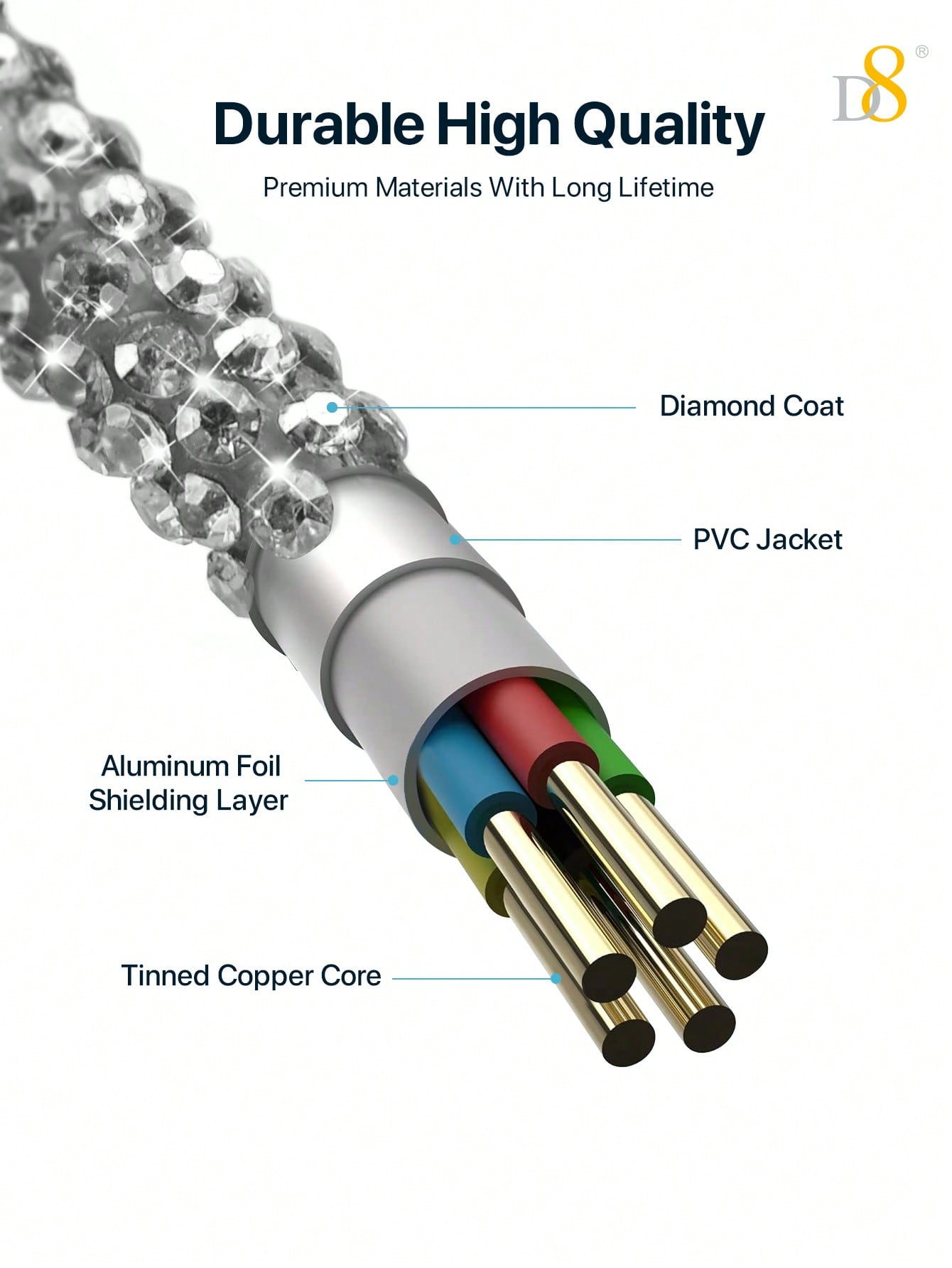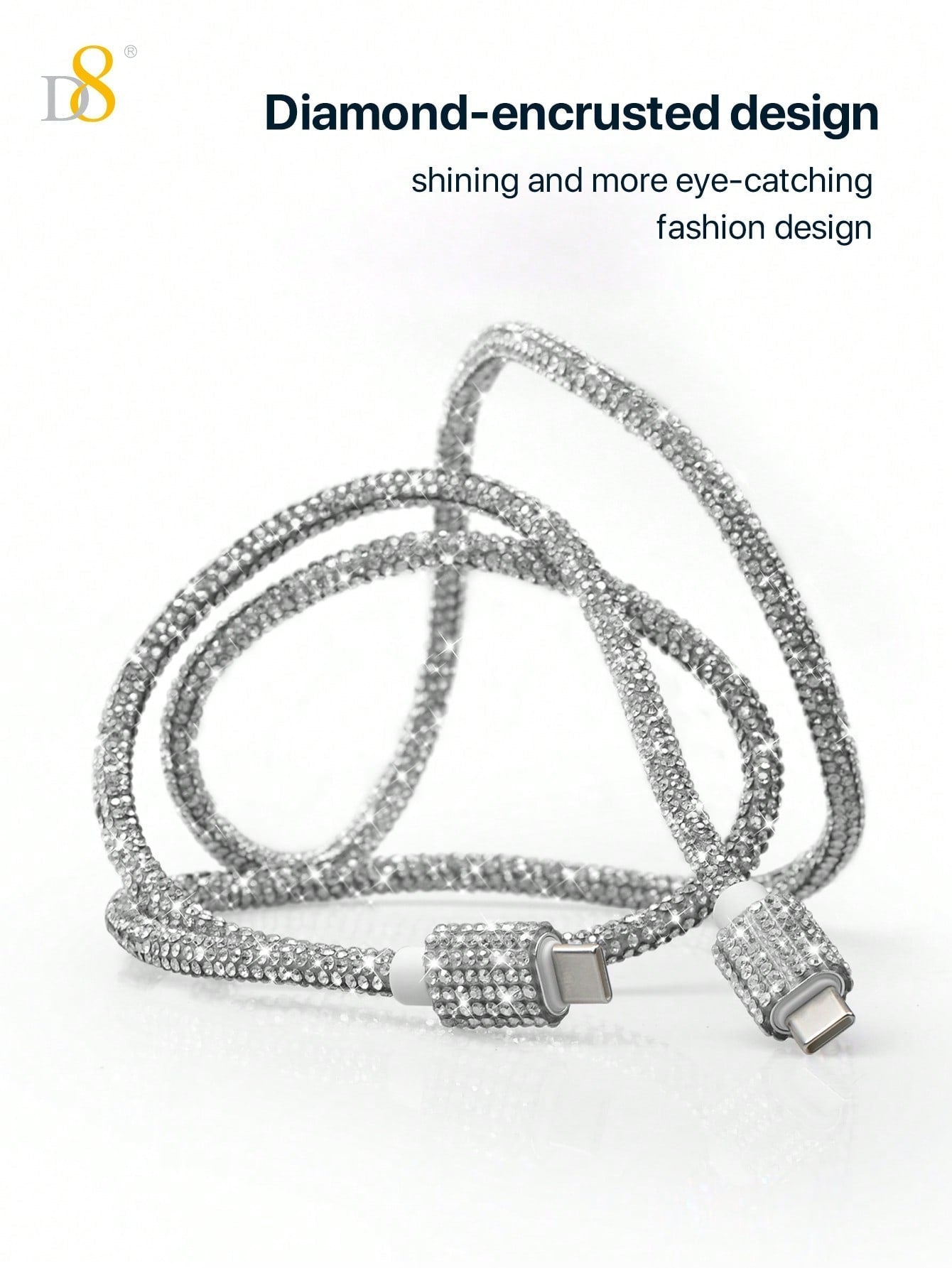 The D8 USB-C to USB-C Cable brings a perfect blend of style and functionality. This 3.3ft cable features 60W fast charging and a stunning rhinestone shine for a unique and elegant look. Designed for the latest devices, it is compatible with top brands like iPhone 16, iPad Pro, Samsung Galaxy S23, and Pixel 7. Whether you're charging your device or transferring data, this cable is designed to provide a fast, reliable connection with an extra touch of glam.