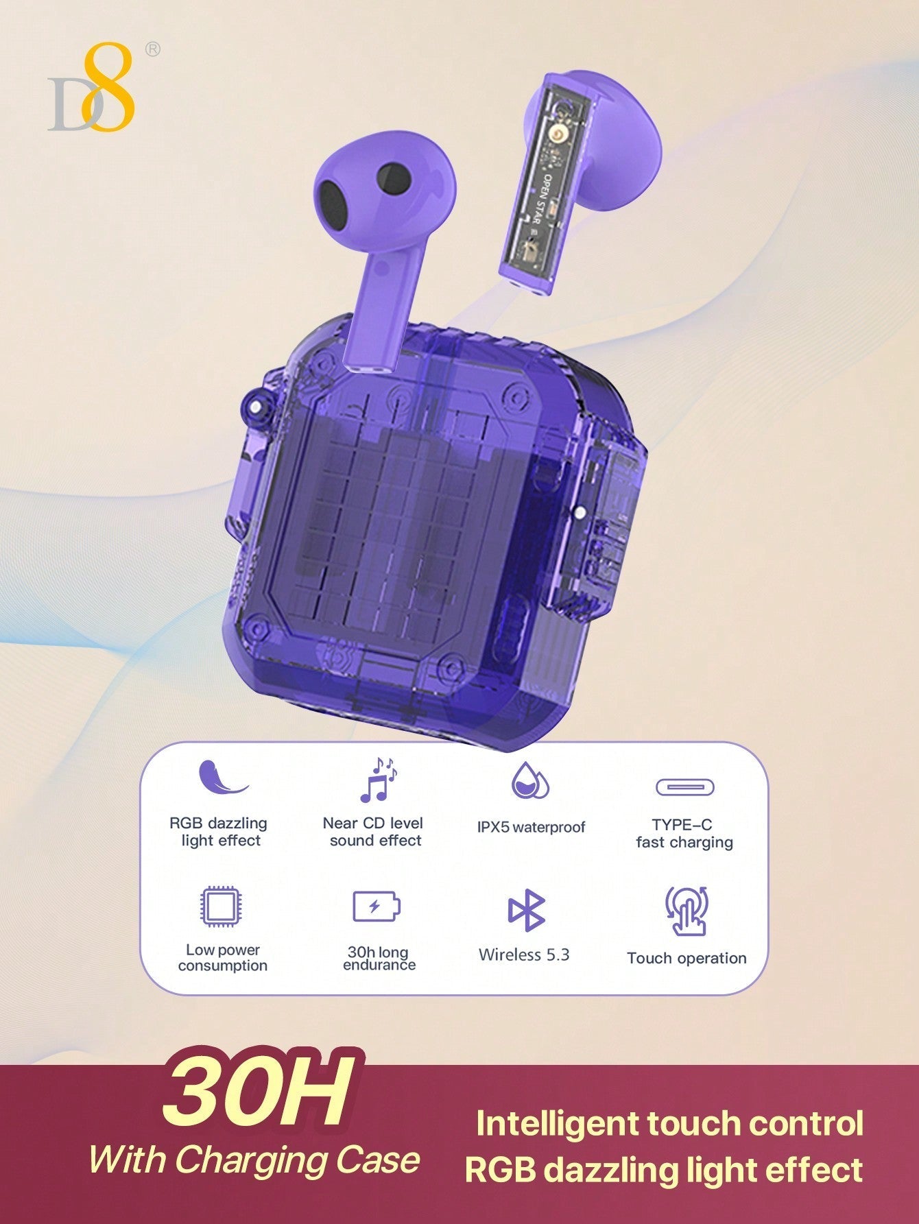 The D8 Wireless Earbuds combine cutting-edge features, such as IPX5 waterproofing, RGB light effects, and near CD-level sound quality, to deliver an exceptional listening experience. With a long-distance connection, built-in microphone, and a convenient charging case, these earbuds are perfect for active individuals, music lovers, and tech enthusiasts. Whether you're working out, gaming, or simply enjoying your favorite songs, the D8 Wireless Earbuds provide a stylish, durable, and high-performance solution for all your audio needs.