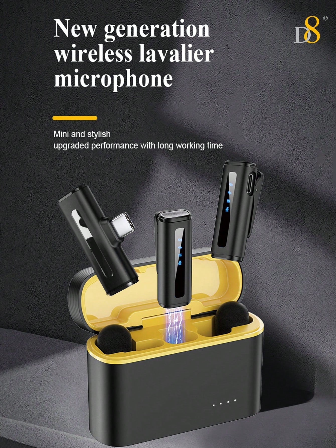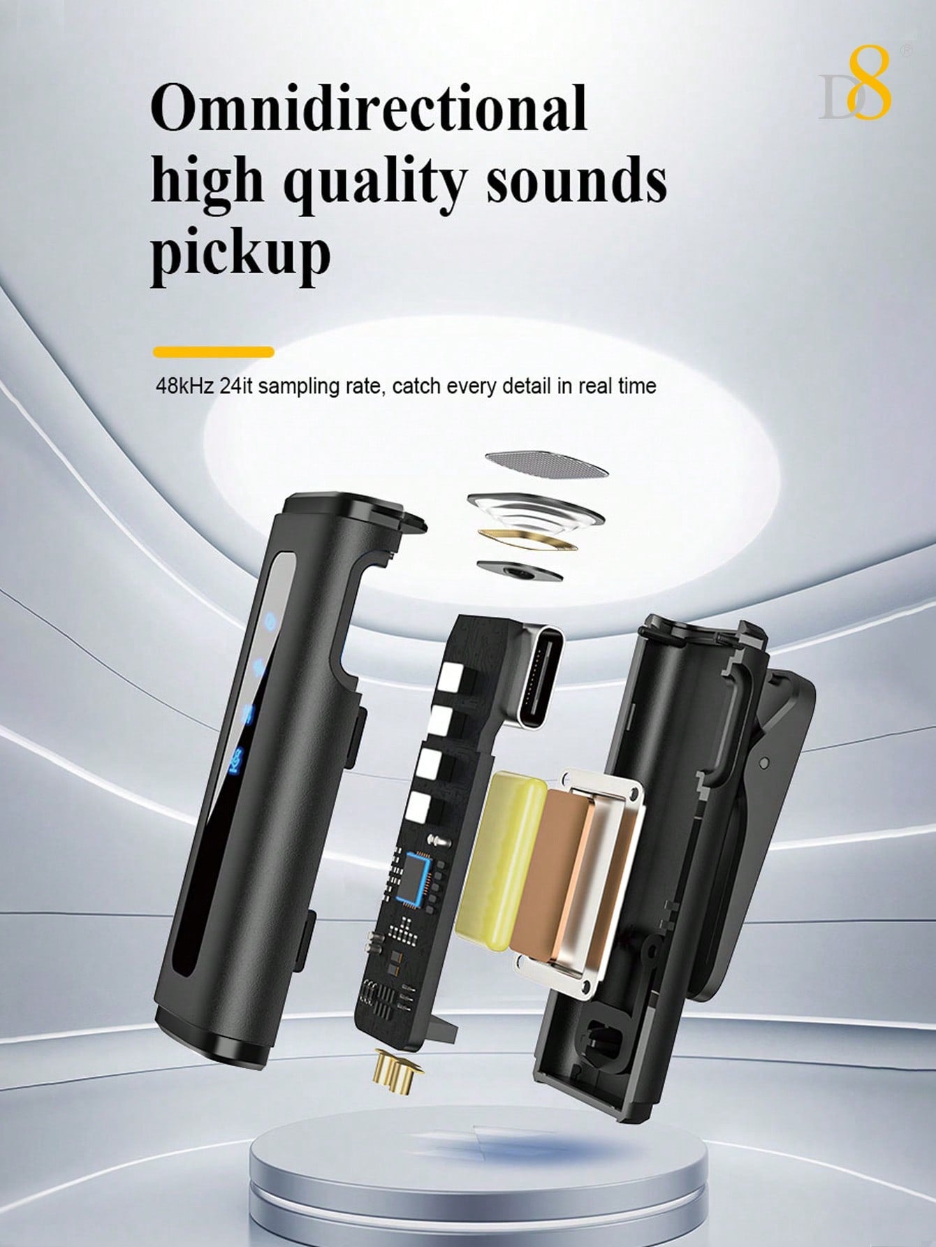 The D8 Wireless Lavalier Microphone is a compact, high-performance mini lapel mic designed for professionals and content creators who demand crystal-clear audio. Whether you’re recording interviews, streaming, or producing video content, this wireless mic ensures superb sound quality with auto-sync and noise reduction technology. With a 24-hour battery life and USB-C compatibility, this microphone is ideal for use with iPhone 15, iPad, and Android devices. Elevate your audio quality to professional levels with this easy-to-use, portable mic.