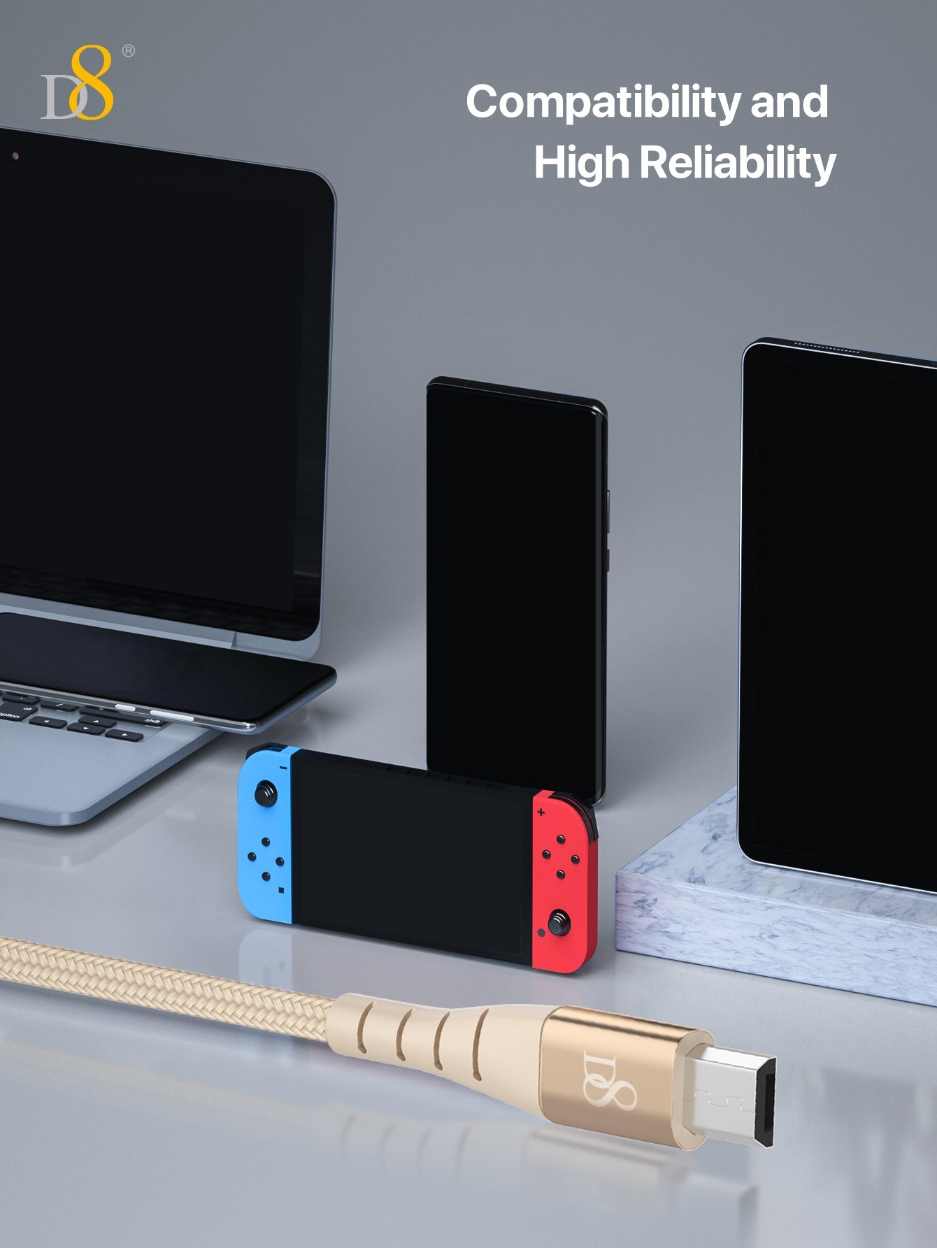 Introducing the D8 Nylon Braided Micro USB Cable, model PSC-0436. This high-quality cable is designed for both power and data synchronization. The nylon braided exterior enhances durability, ensuring the cable is not easily damaged and can withstand daily wear and tear. The special SR design provides additional durability, making it a long-lasting accessory for your mobile devices.