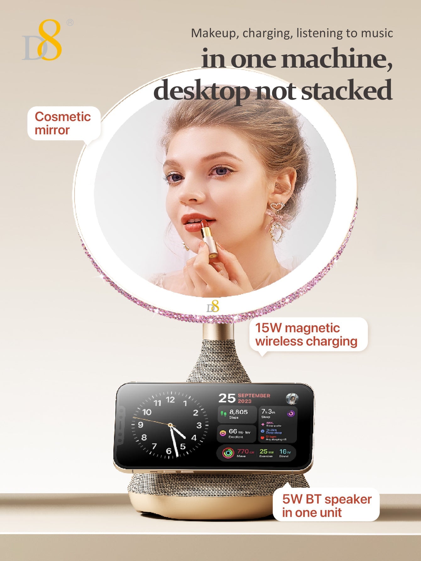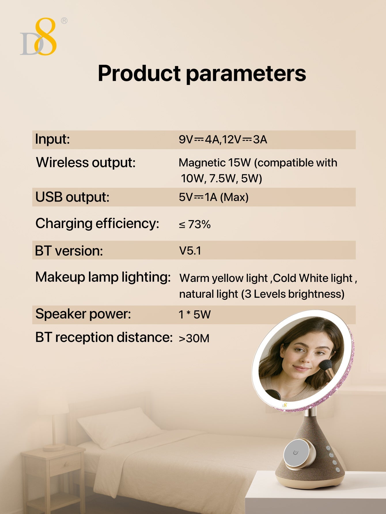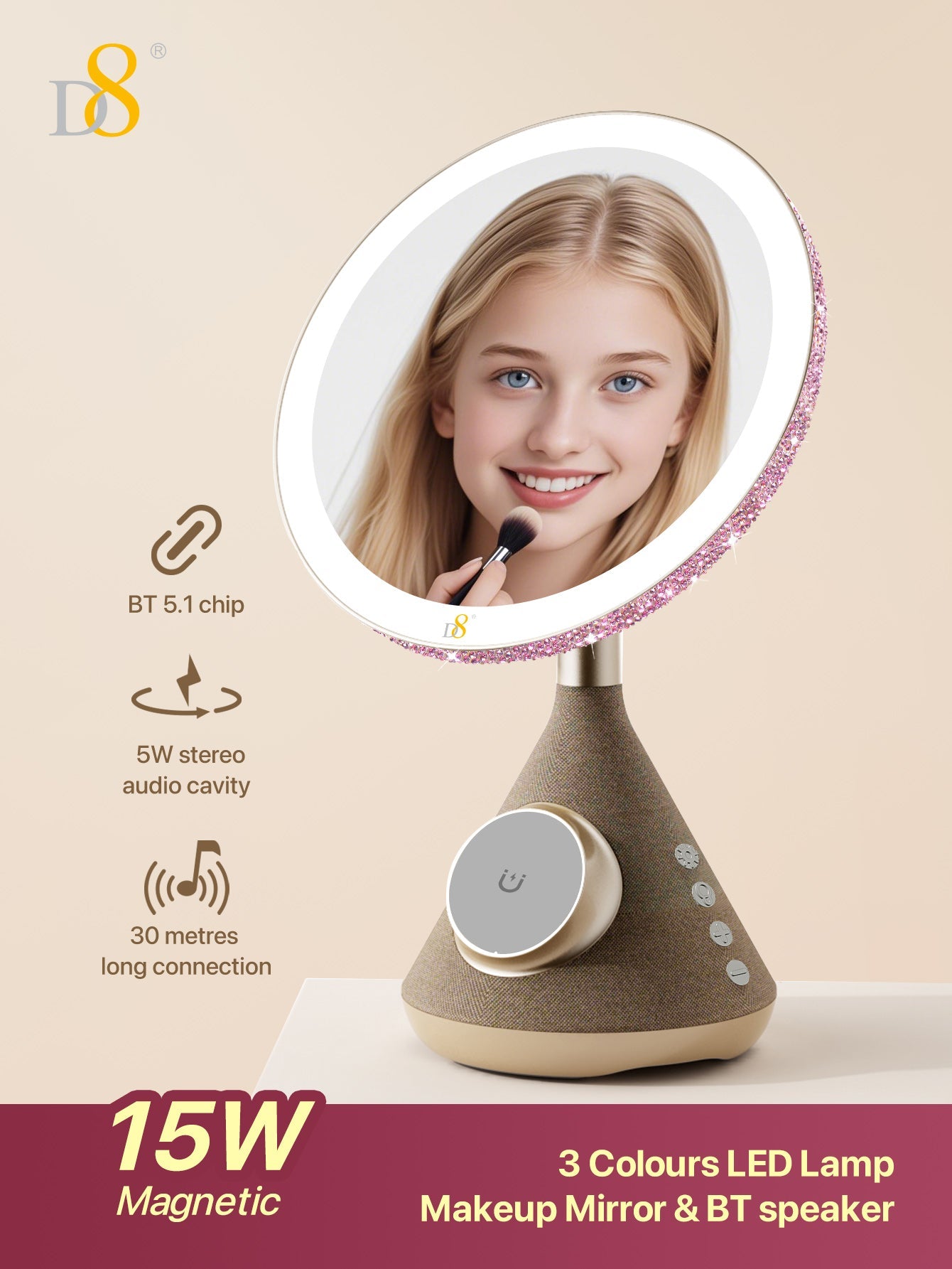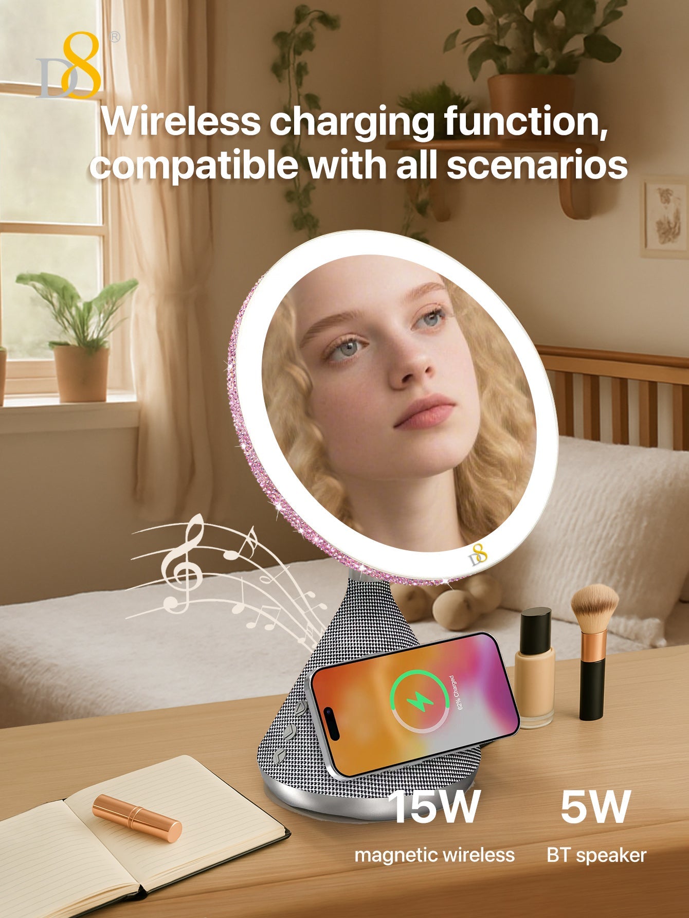 The D8 Magnetic Wireless Vanity Mirror isn’t just a mirror—it’s a lifestyle upgrade. Combining cutting-edge charging, professional lighting, and immersive sound, it transforms daily routines into luxurious moments. Perfect for makeup lovers, busy professionals, or anyone craving a touch of tech-savvy glamour.