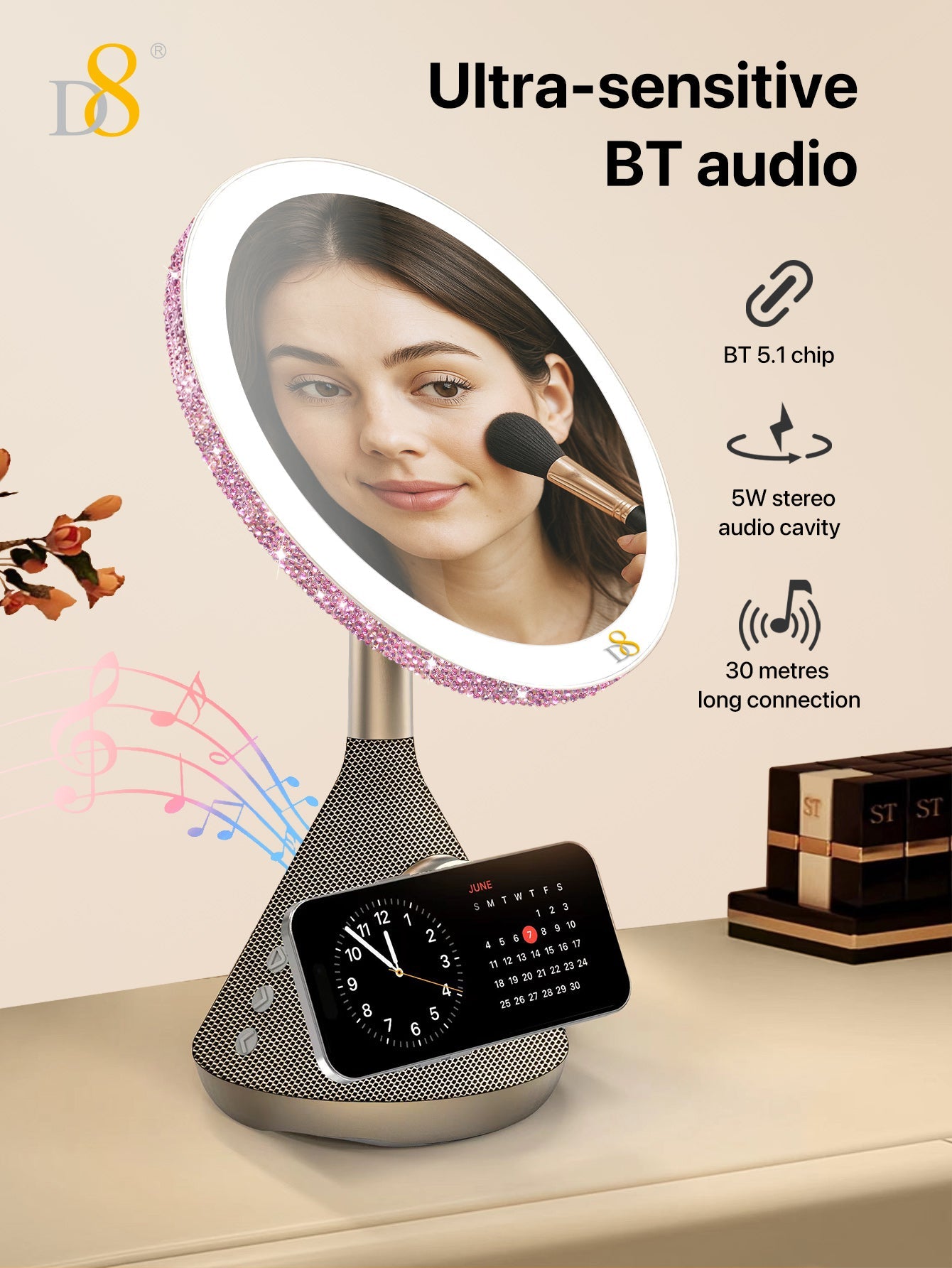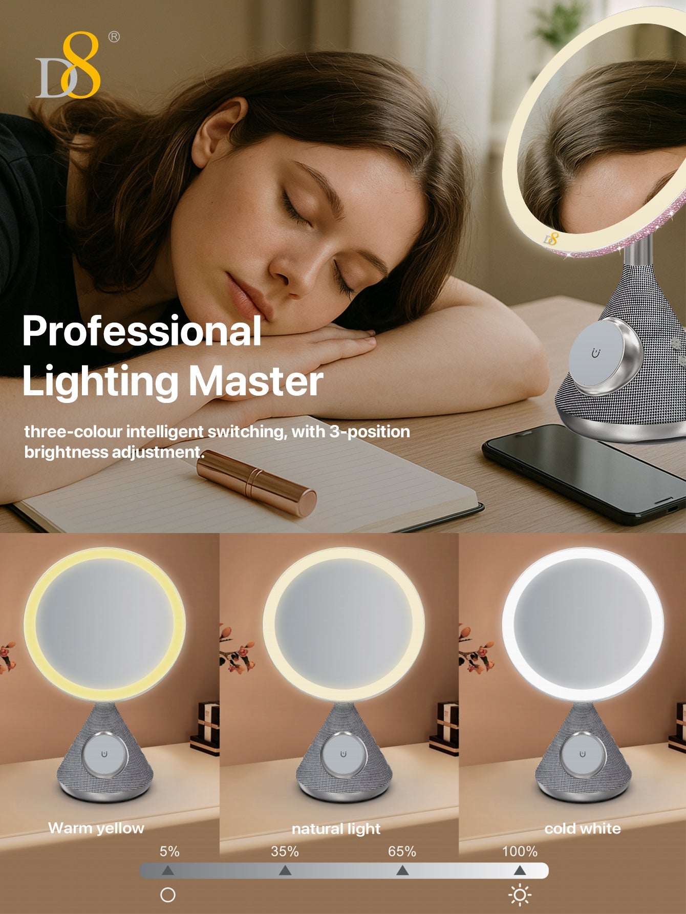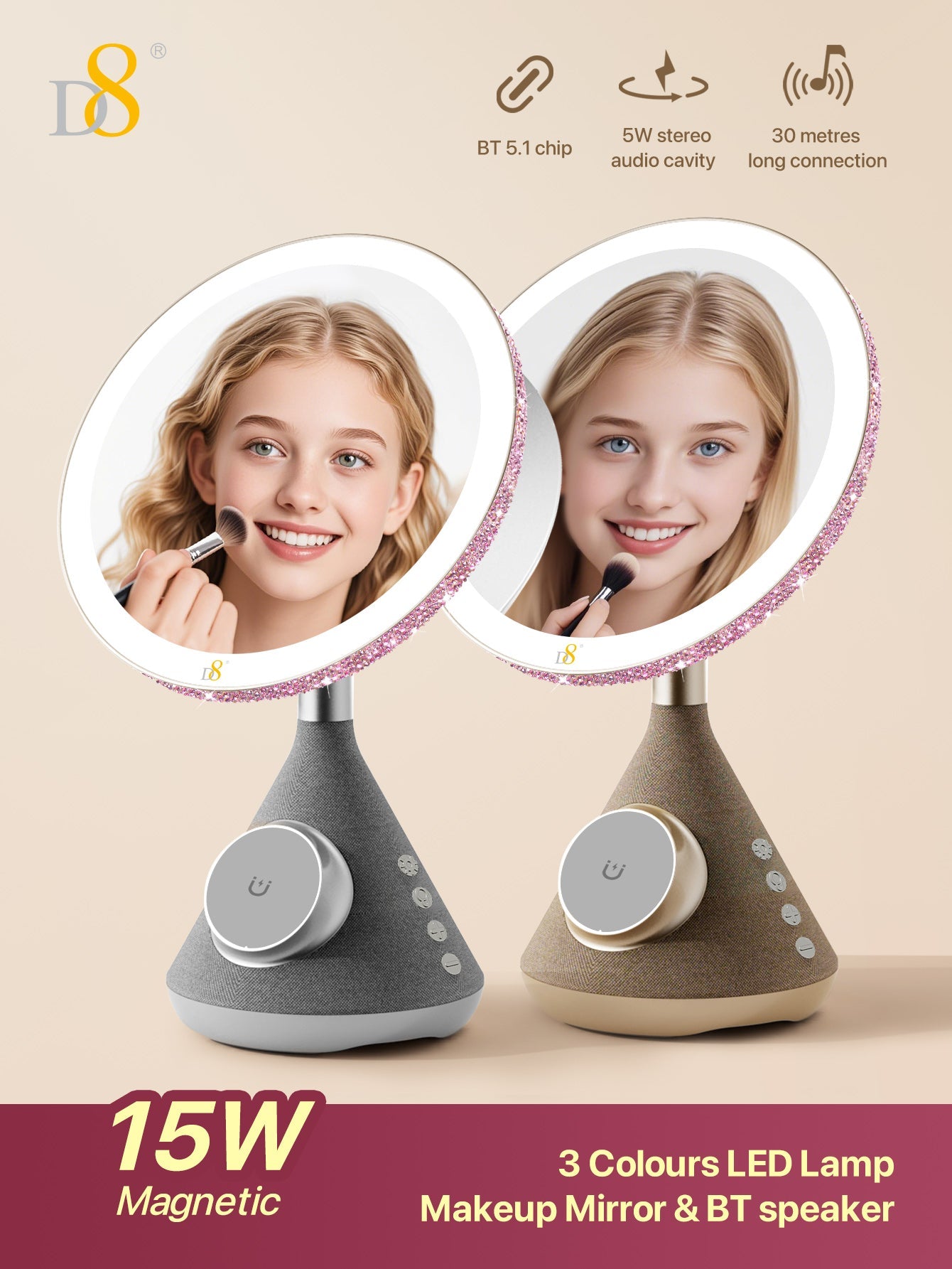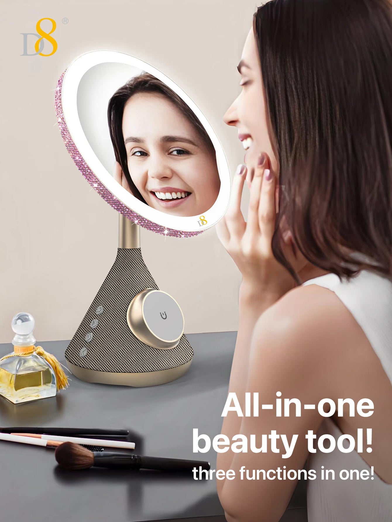 The D8 Magnetic Wireless Vanity Mirror isn’t just a mirror—it’s a lifestyle upgrade. Combining cutting-edge charging, professional lighting, and immersive sound, it transforms daily routines into luxurious moments. Perfect for makeup lovers, busy professionals, or anyone craving a touch of tech-savvy glamour.