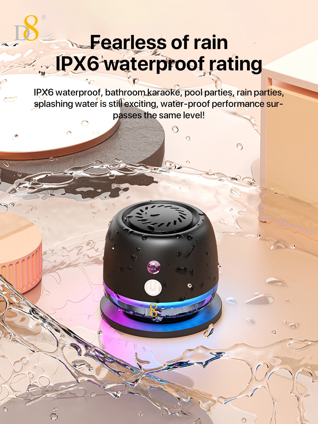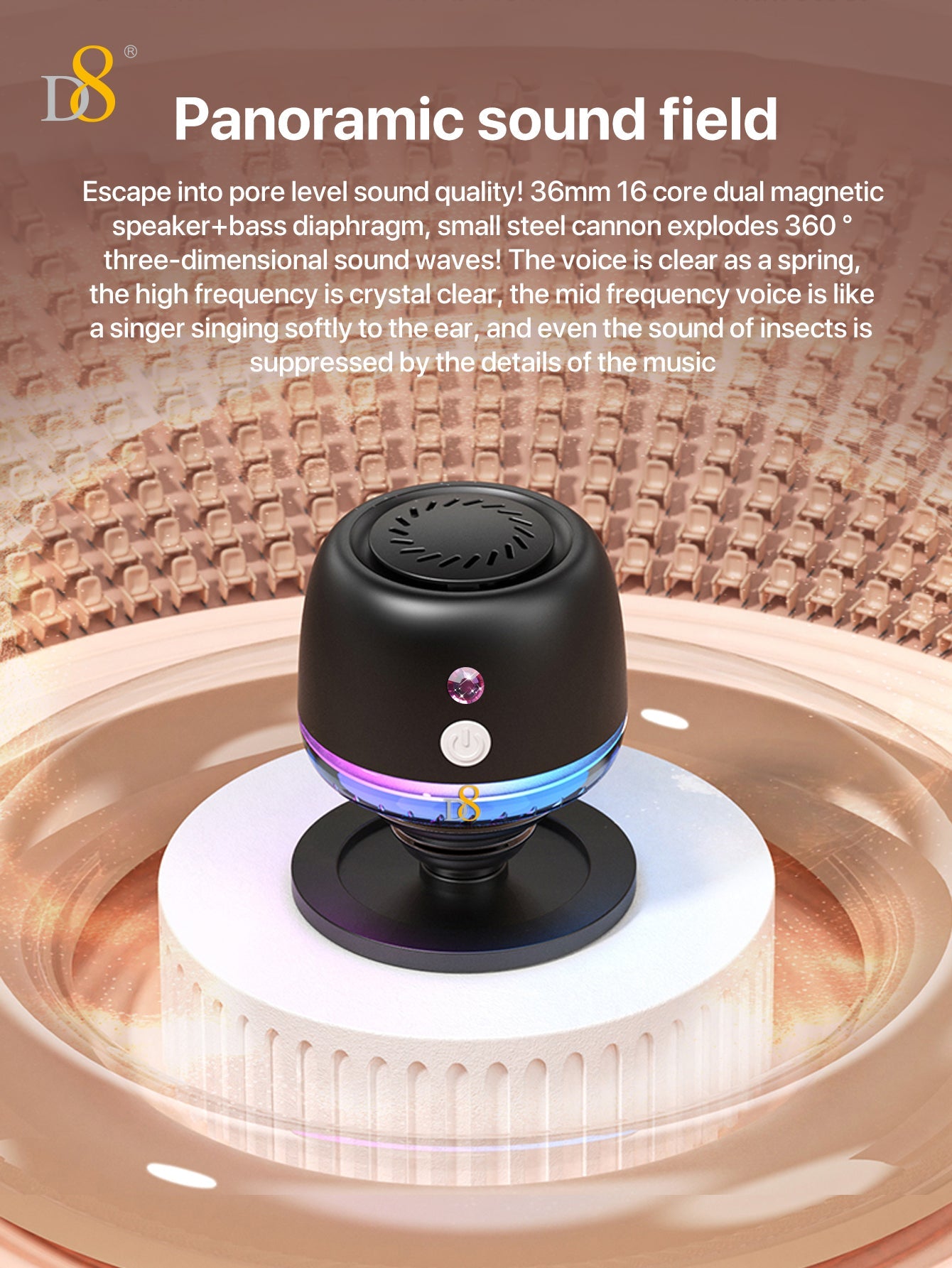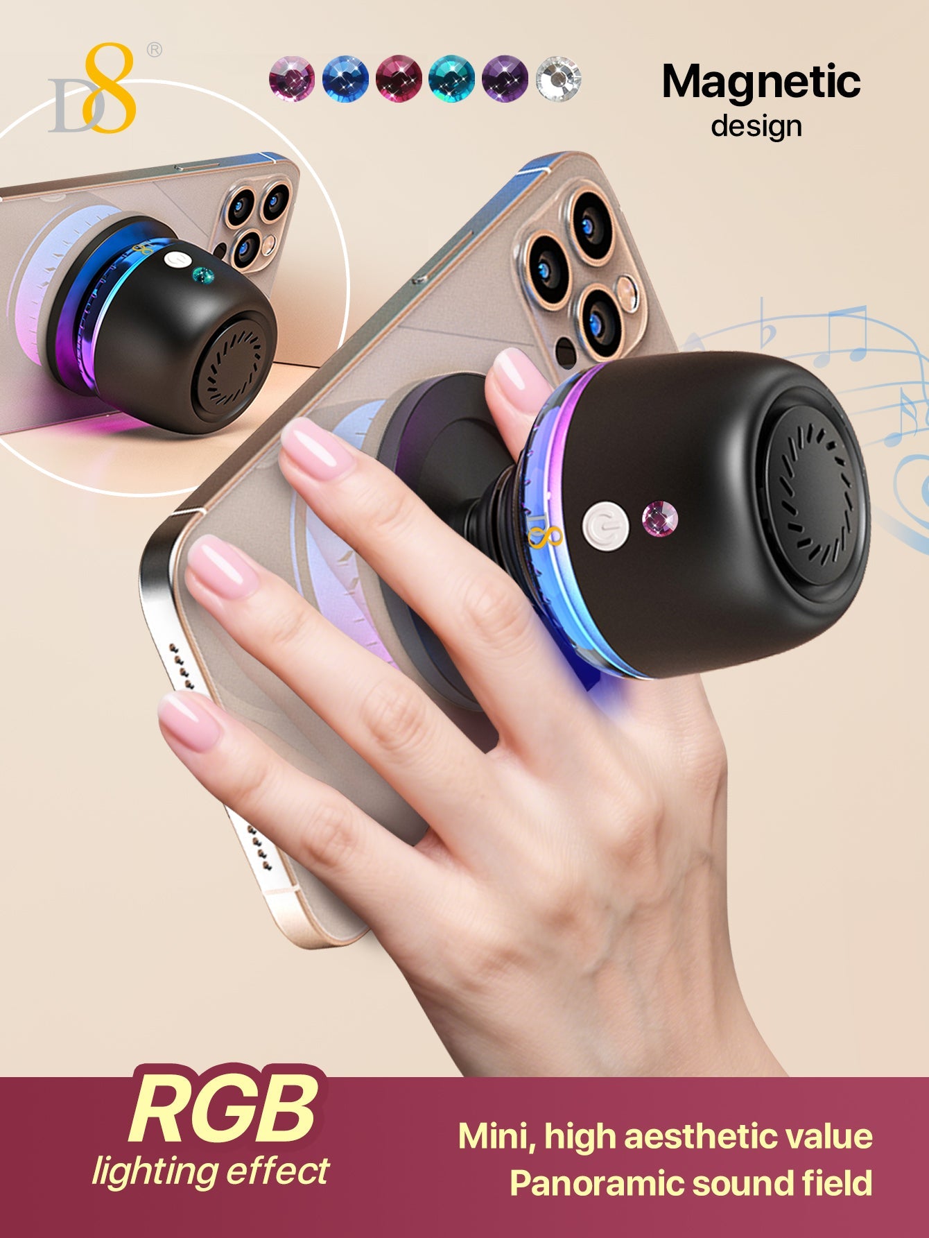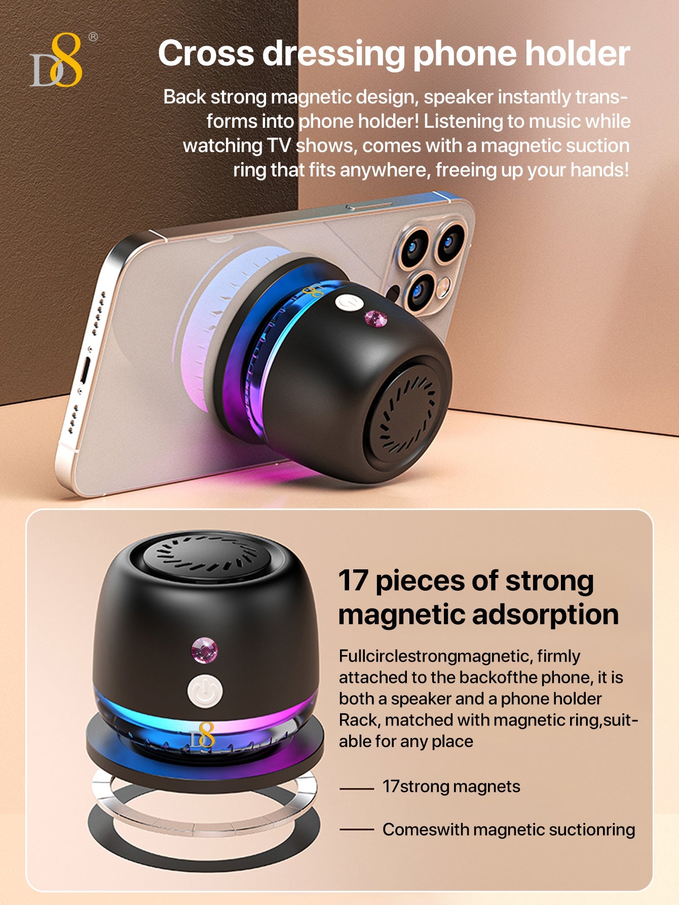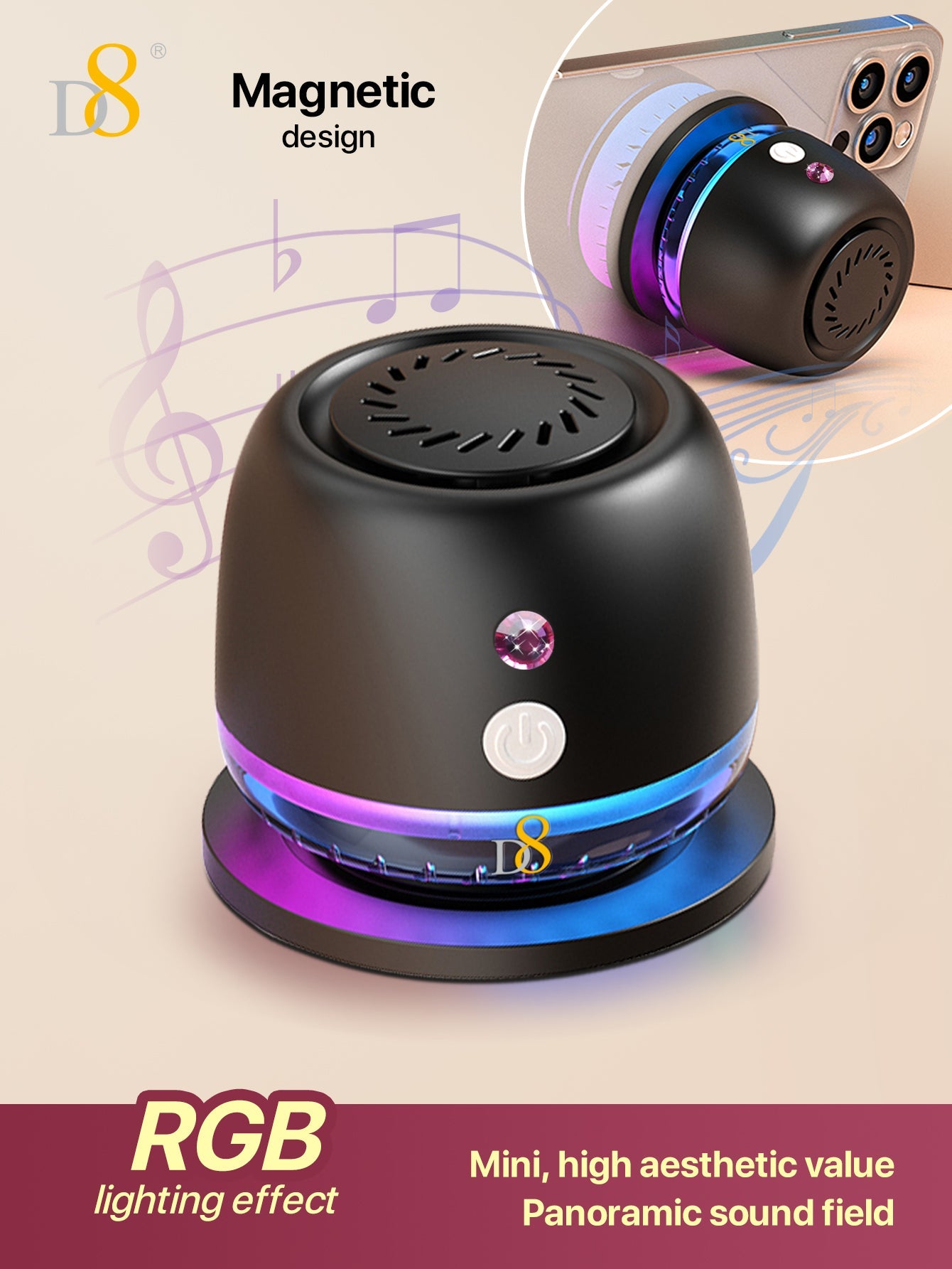 D8 Wireless Induction Magnetic Bluetooth Speaker, Portable Mini Bluetooth Loudspeaker with Bass Diaphragm, 5W Internal-Magnet, 10H Playtime, RGB Light, Including Magnetic Ring and Lanyard, Silicone folding air cabinInnovative folding airbag structure